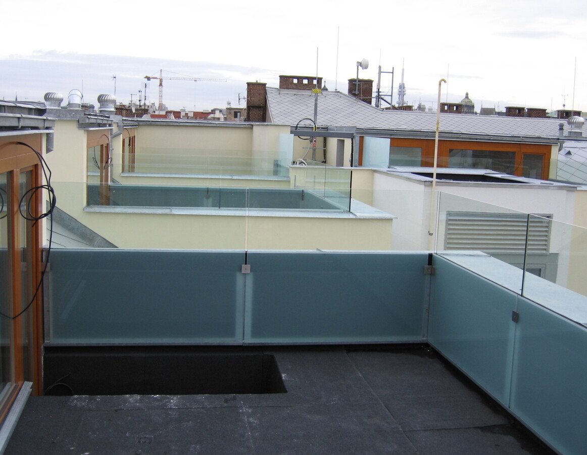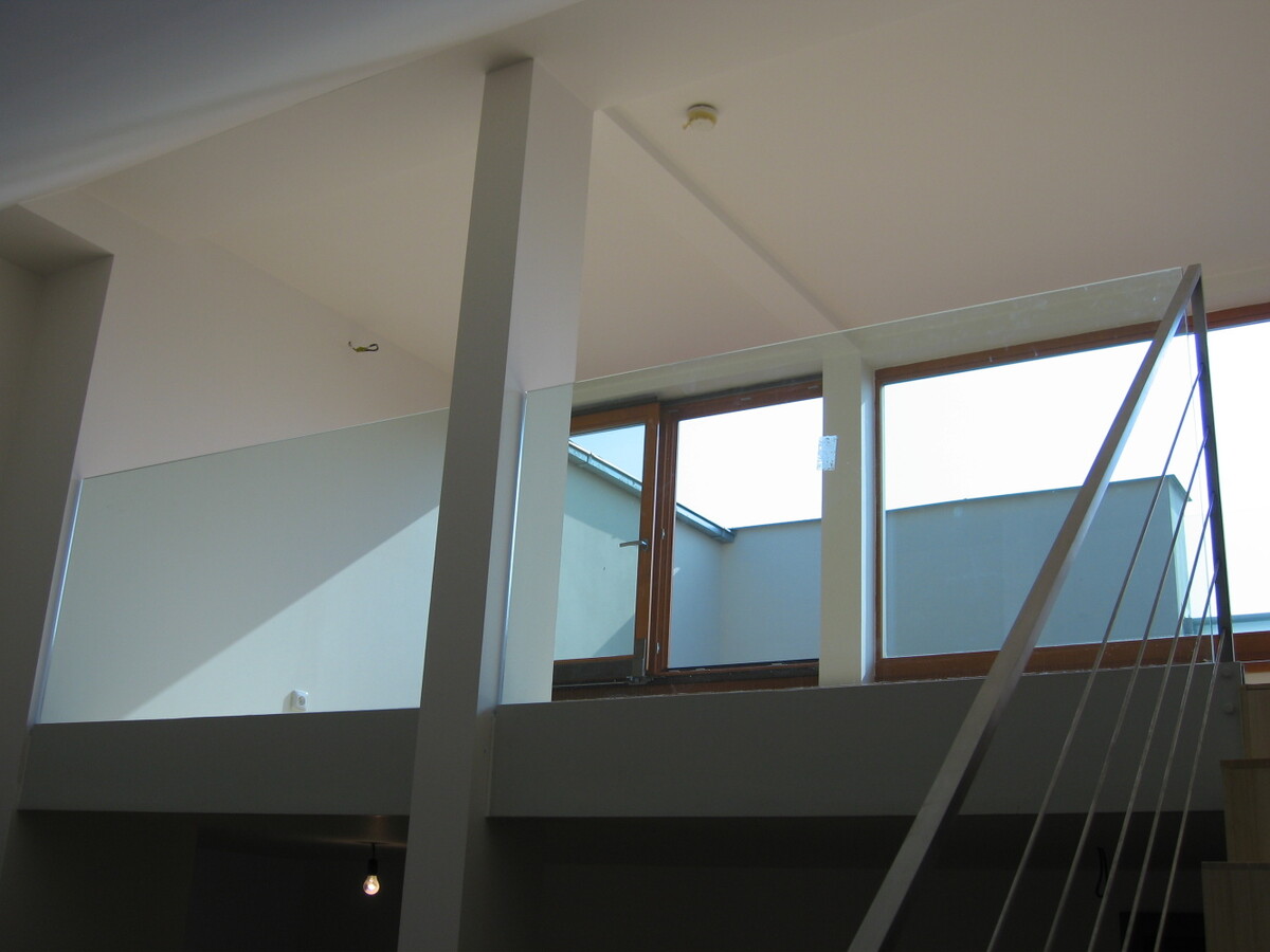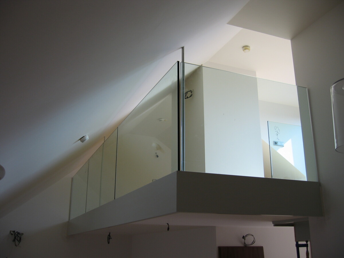 Exterierové zábradlí atik balkonů, interierová zábradlí z bezpečnostního skla.
