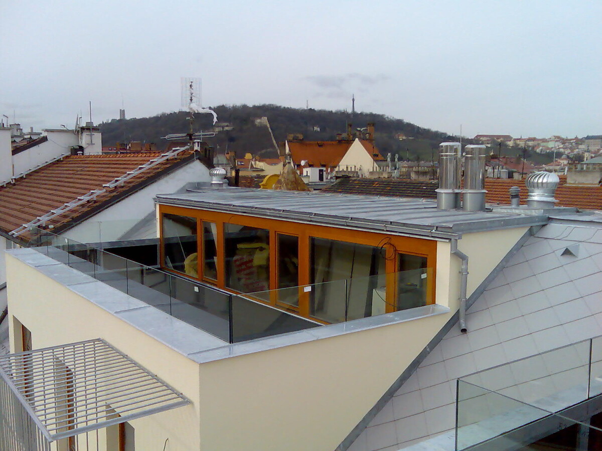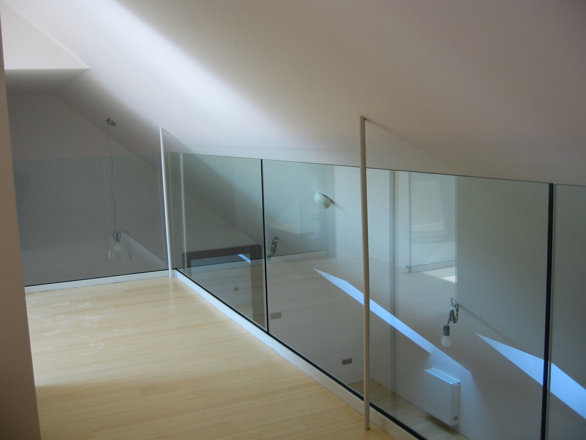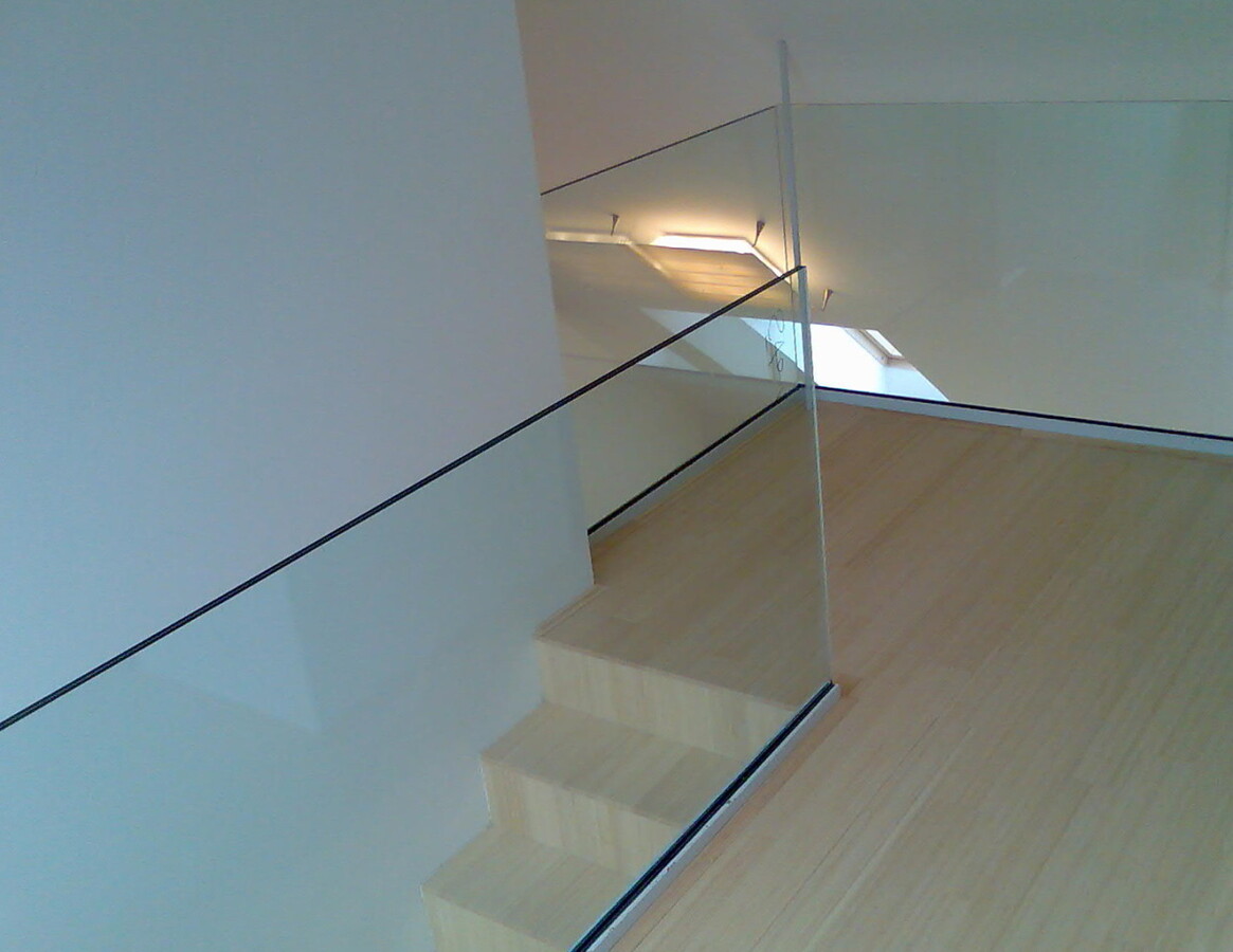 Exterierové zábradlí atik balkonů, interierová zábradlí z bezpečnostního skla.