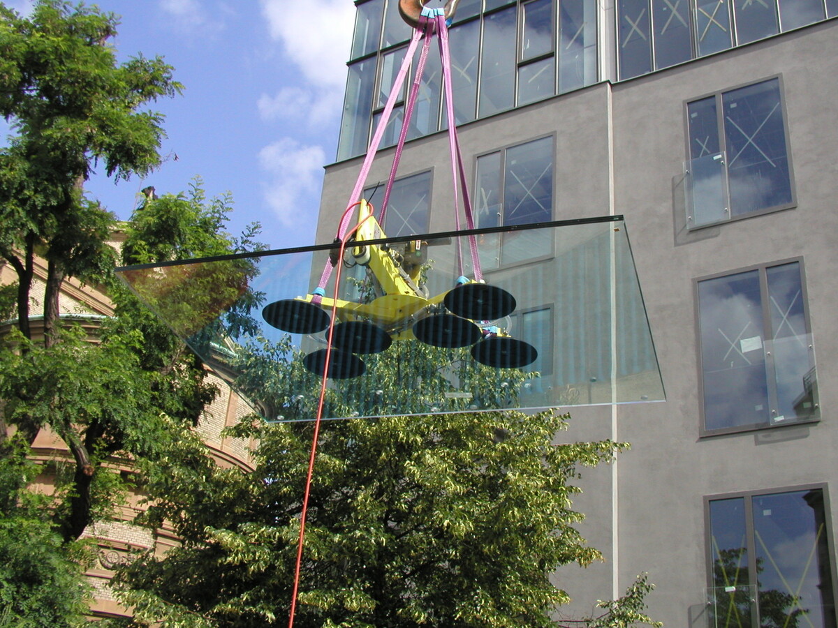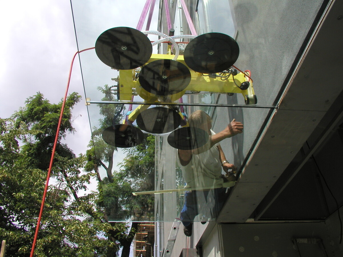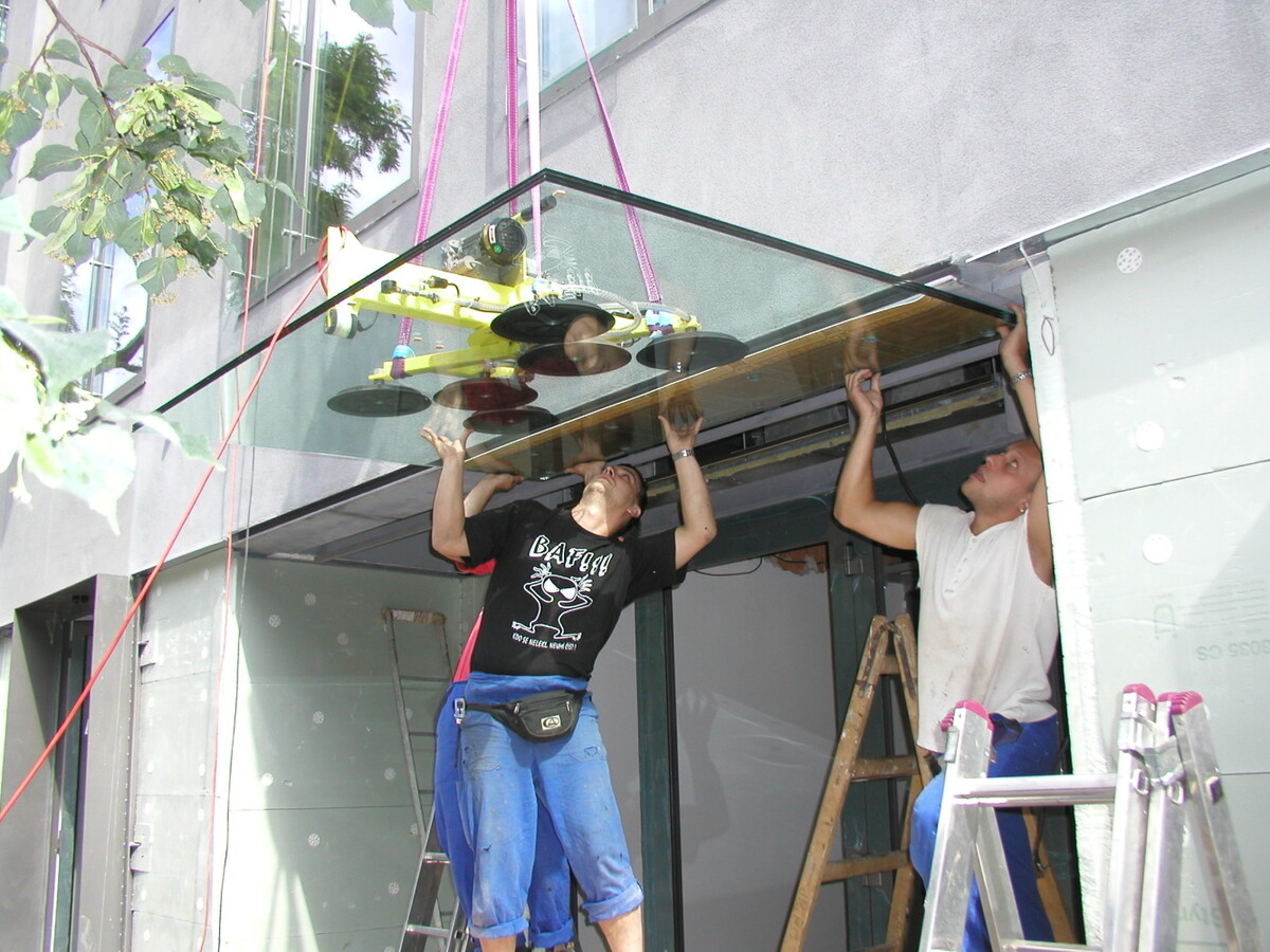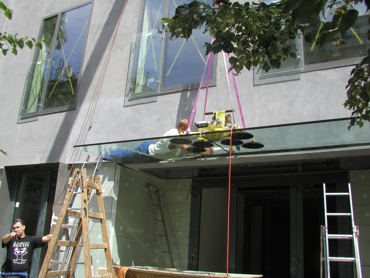 Venkovní markýza z kaleného třívrstvého skla Connex 3x8 ESG. Sklo jako letmo vetknutý nosník bez podpory. Montáž skla Savkovým rámem a autojeřábem.