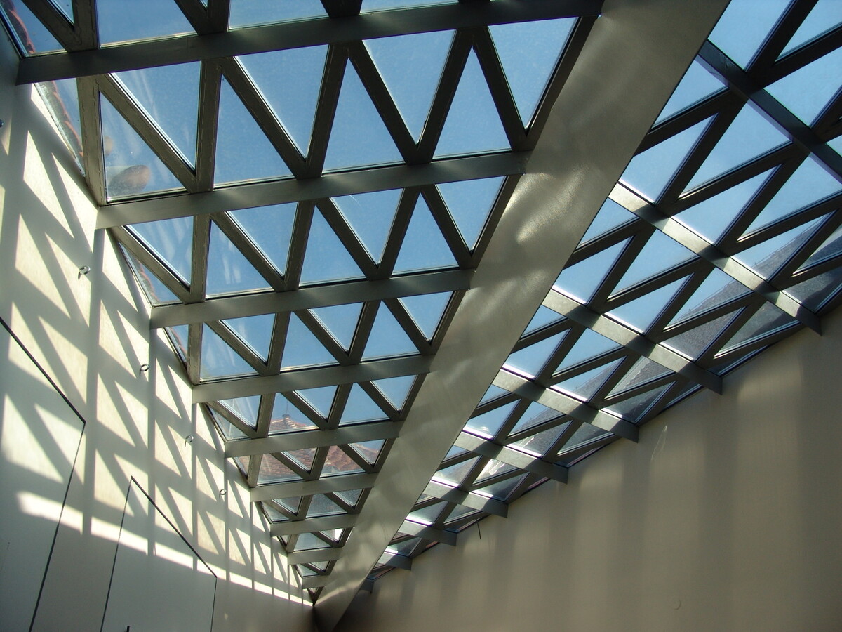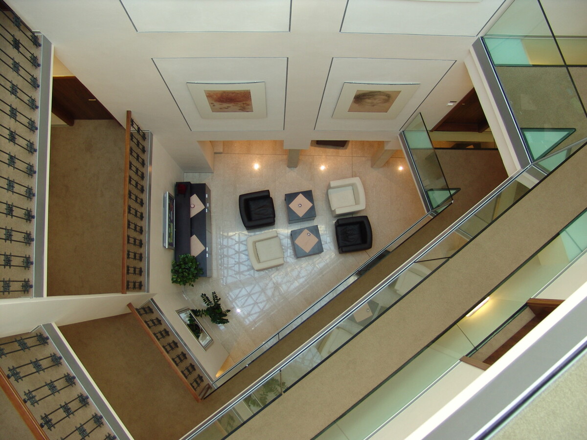 Prosvětlující pásy z pochozího skla v podlaze vnitřních balkonů atria hotelu.