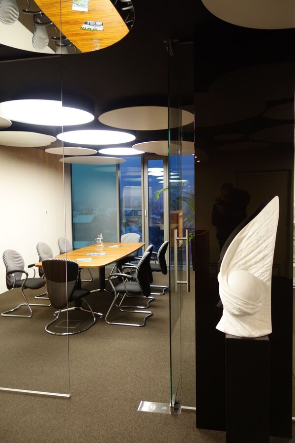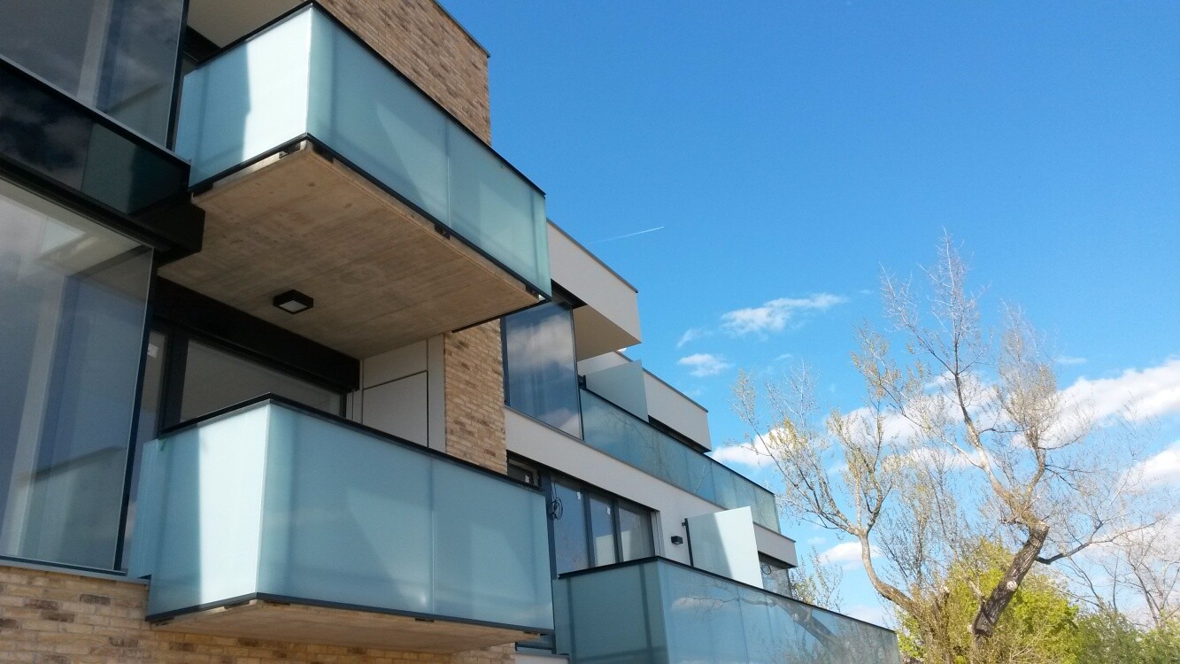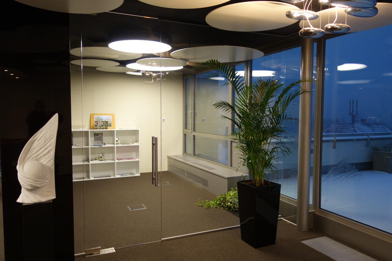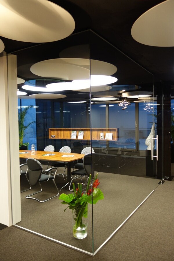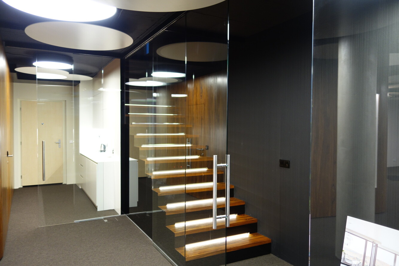 Celoskleněné příčky z kaleného skla ESG 10 mm s kyvnými a posuvnými dveřmi.