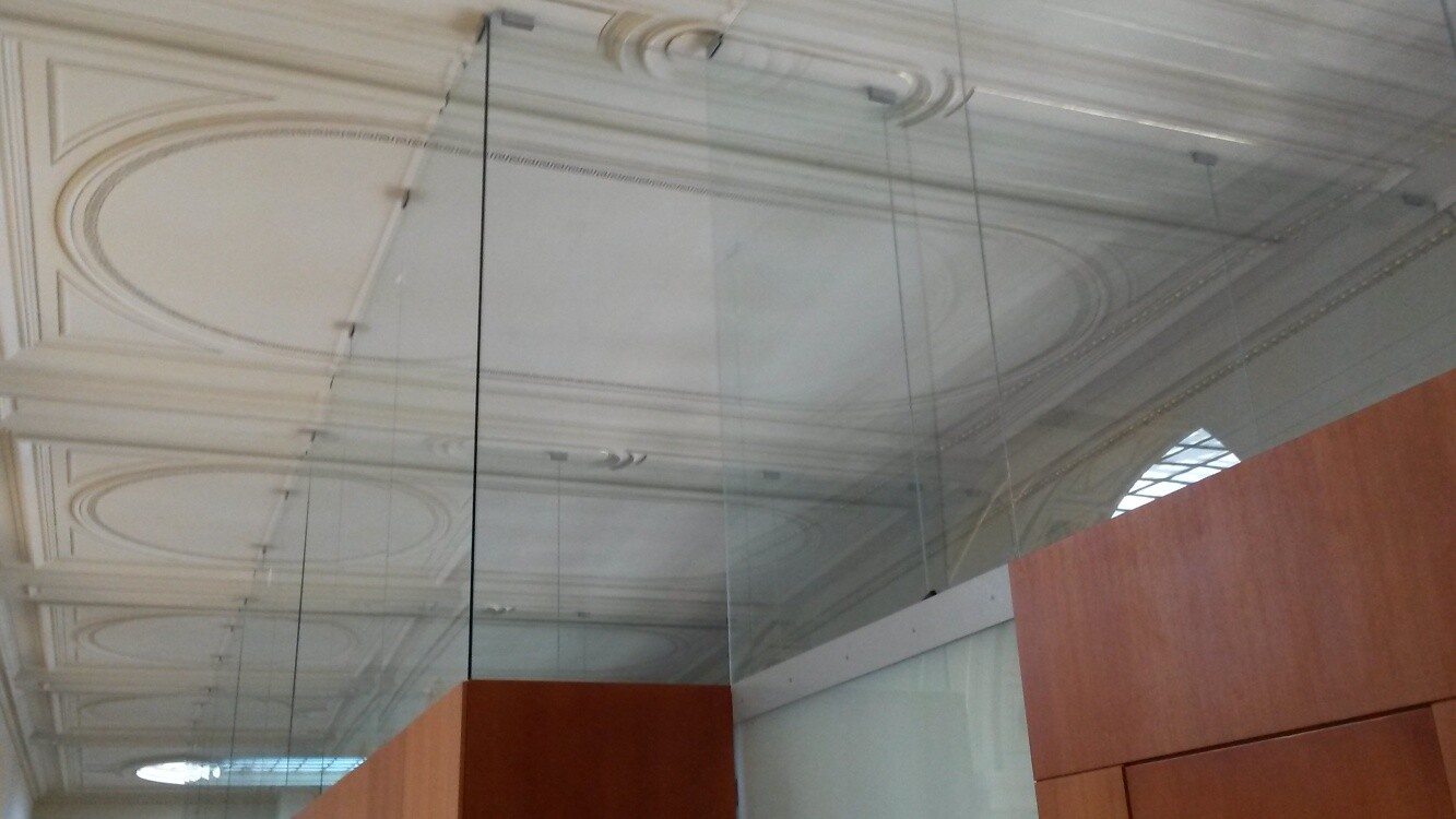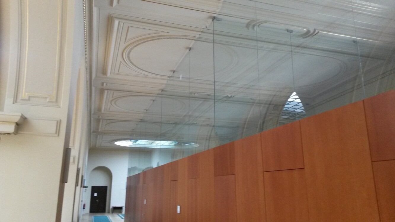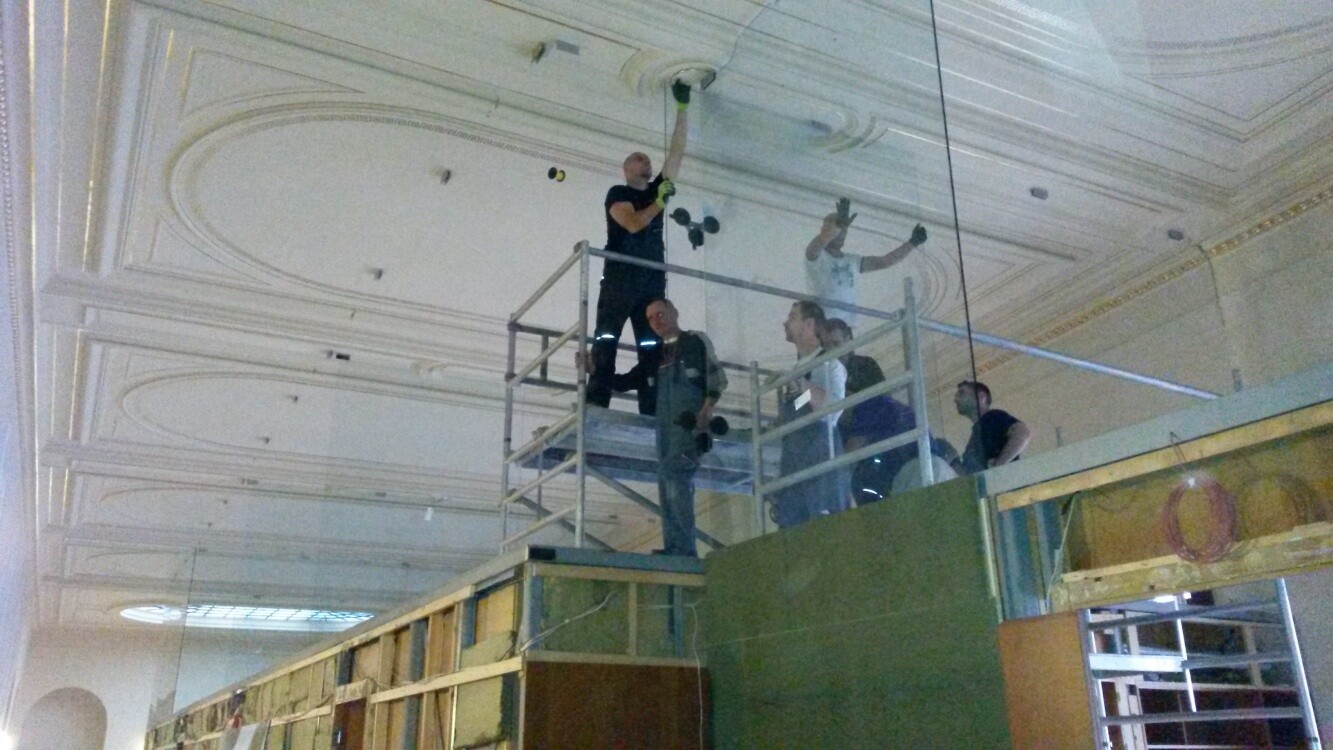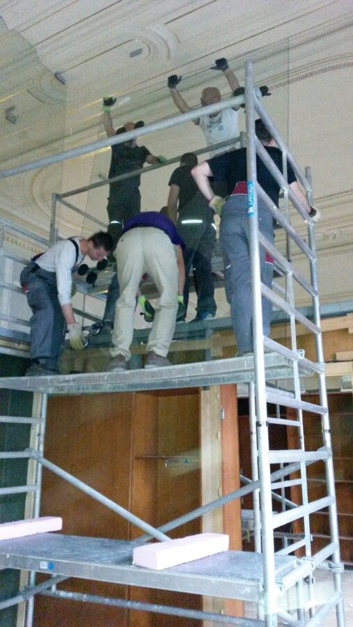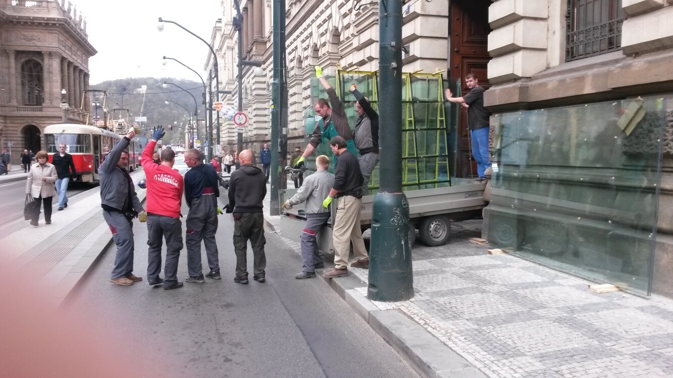 Sklo ESG 12 mm - 30 tabulí každá o váze 200 kg ručně po schodech transportováno do 2. patra budovy poté zvedáno do výšky cca 3,5 m na lešení a na stěny přepážek kanceláří.