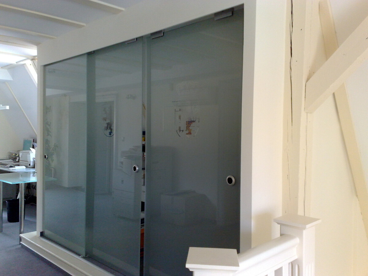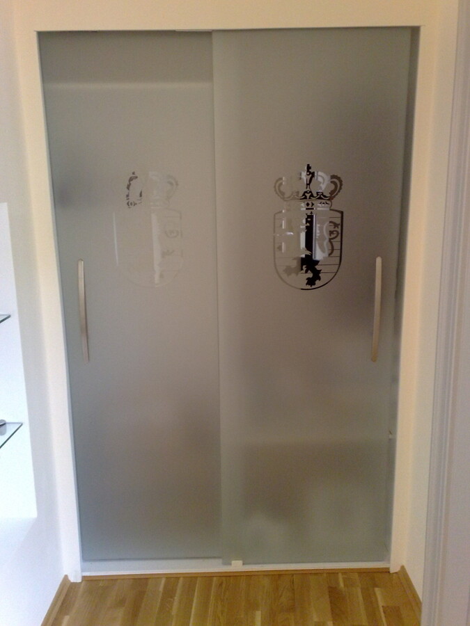 Realizace interiérových posuvných i kyvných dveří s designovým polepem a logem.