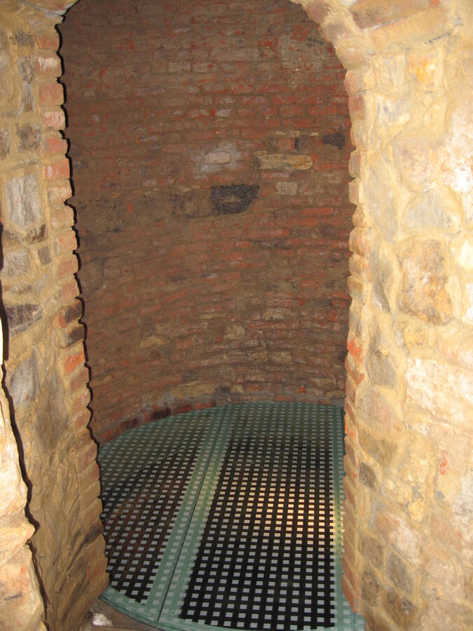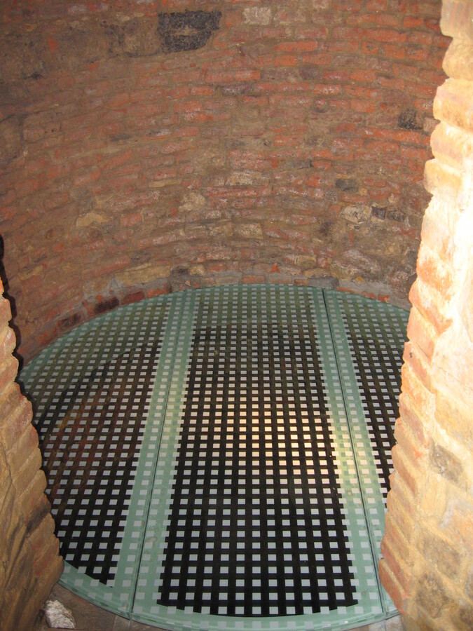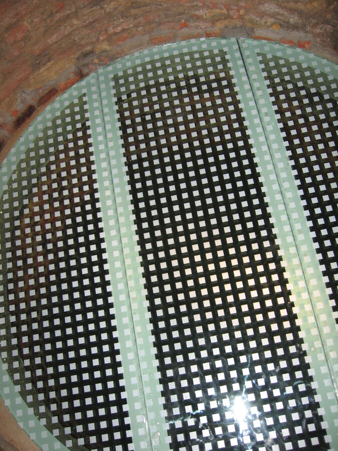 Záklop historické studny z doby Karla IV. pochozím sklem s protiskluzovým dekorem, který je nanesen sítotiskem a zakalen do horní pochozí plochy skla.