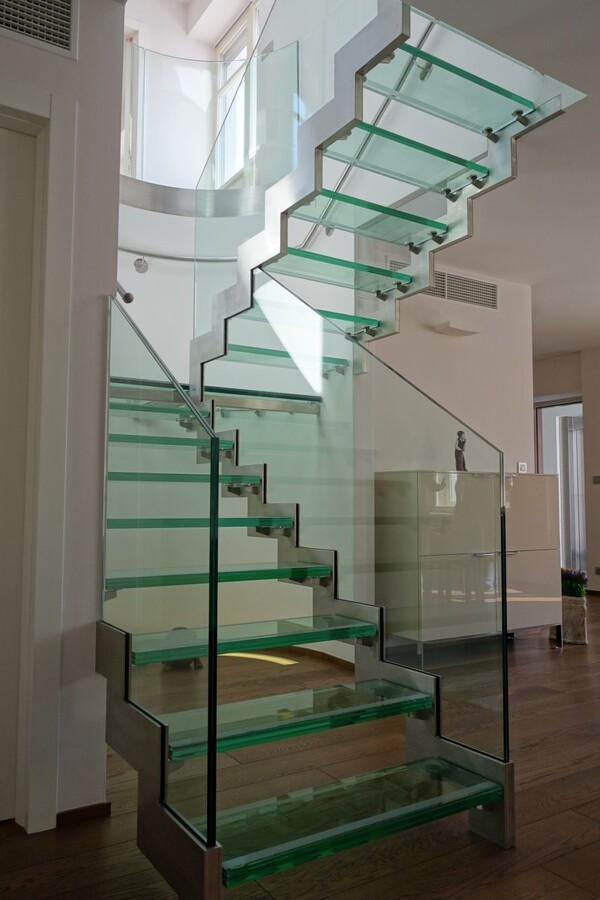 Skla schodů lepeny na nerezové terče lepidlem vytvrzujícím UV světlem pro dokonalý neviditelný spoj.