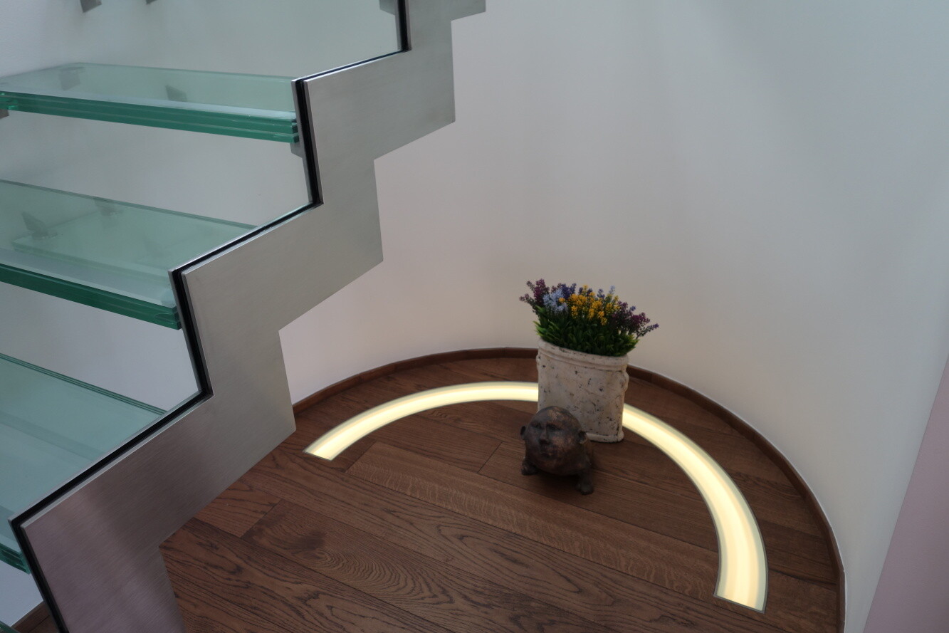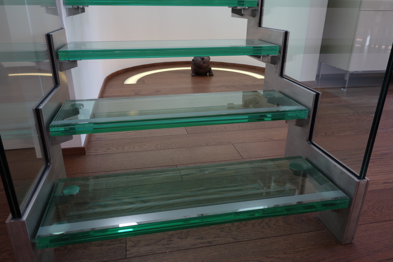 Stupně ze skla ESG VSG 3 x 12 mm opatřeny na sestupové hraně protiskluzovou úpravou.