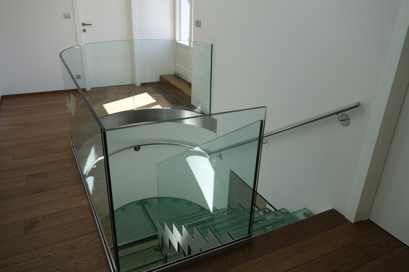 Samonosné celoskleněné zábradlí ze skla VSG 10.10.4. Hrany skla ve vysokém lesku.