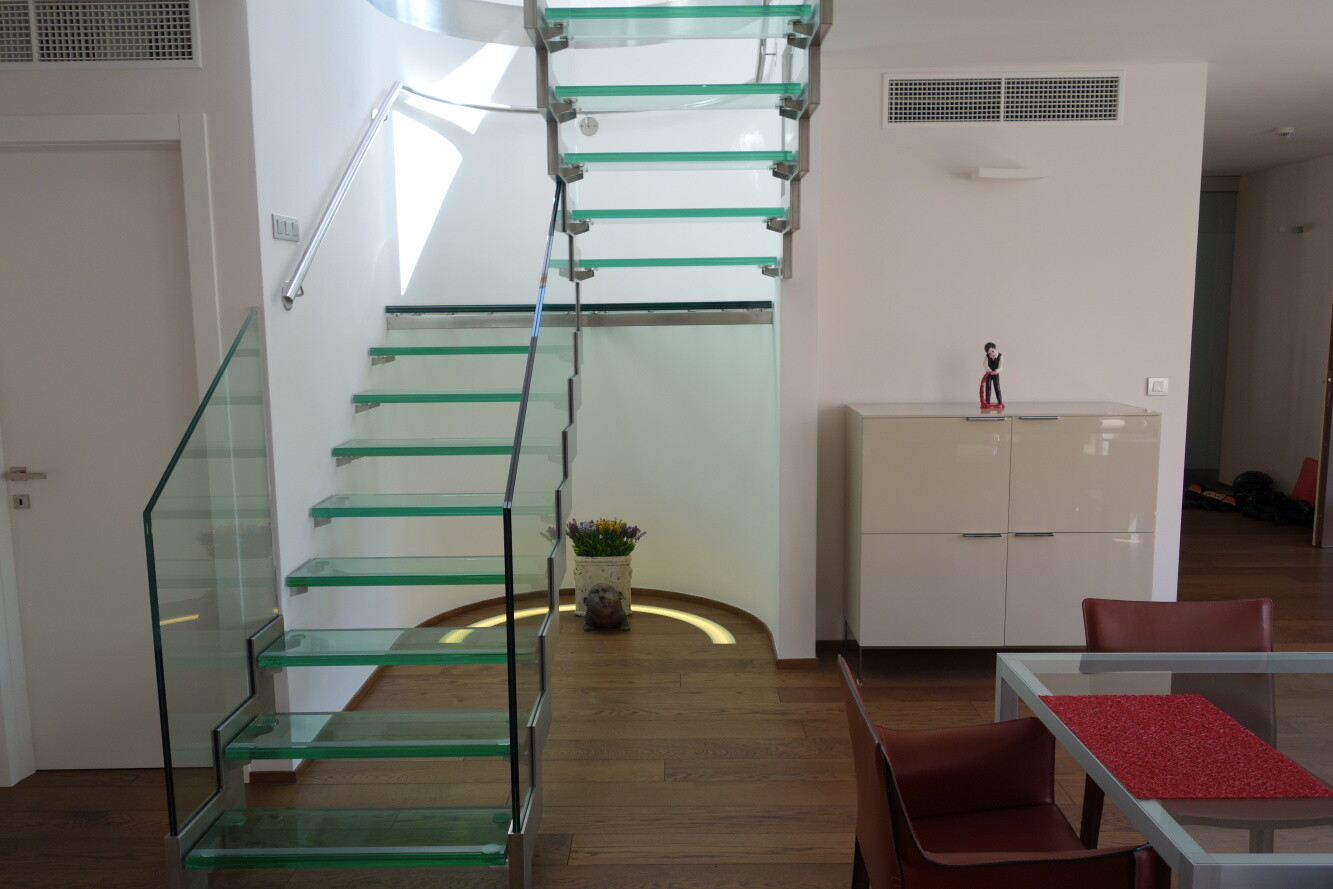MEZONET PETRSKÉ NÁM. - skleněné stupně schodů, ohýbané sklo zábradlí