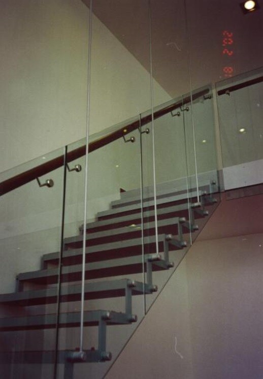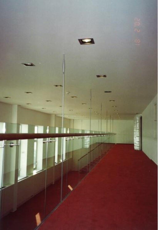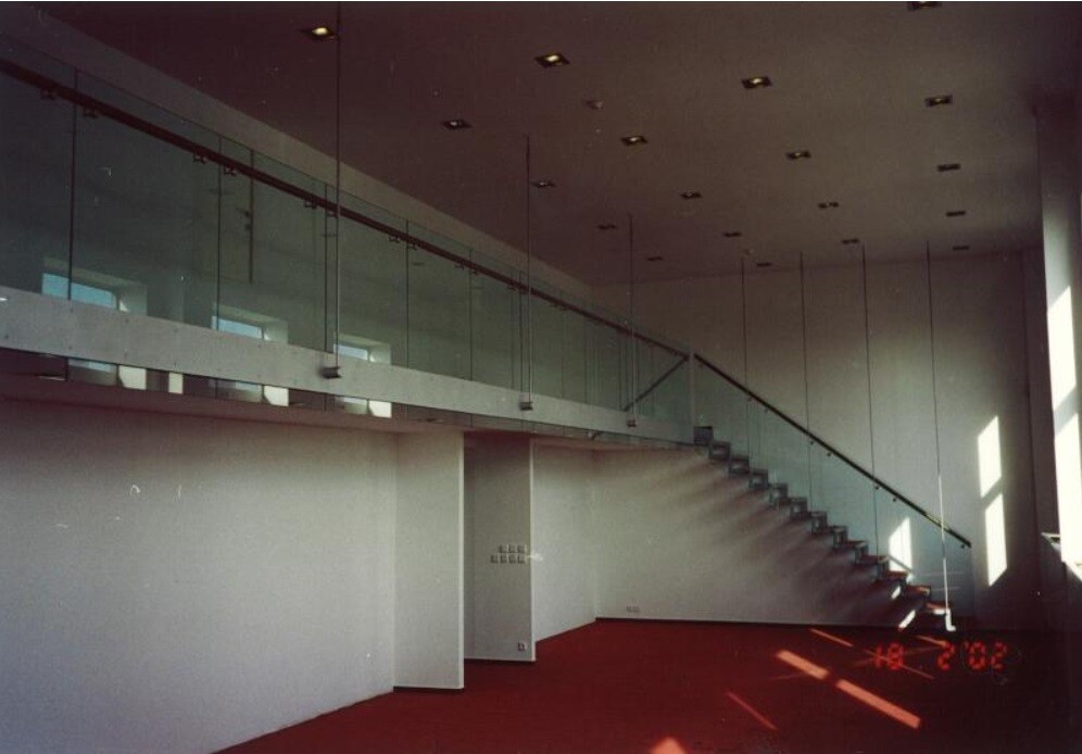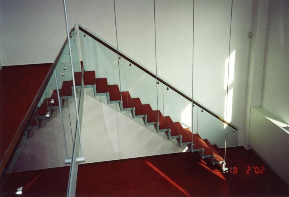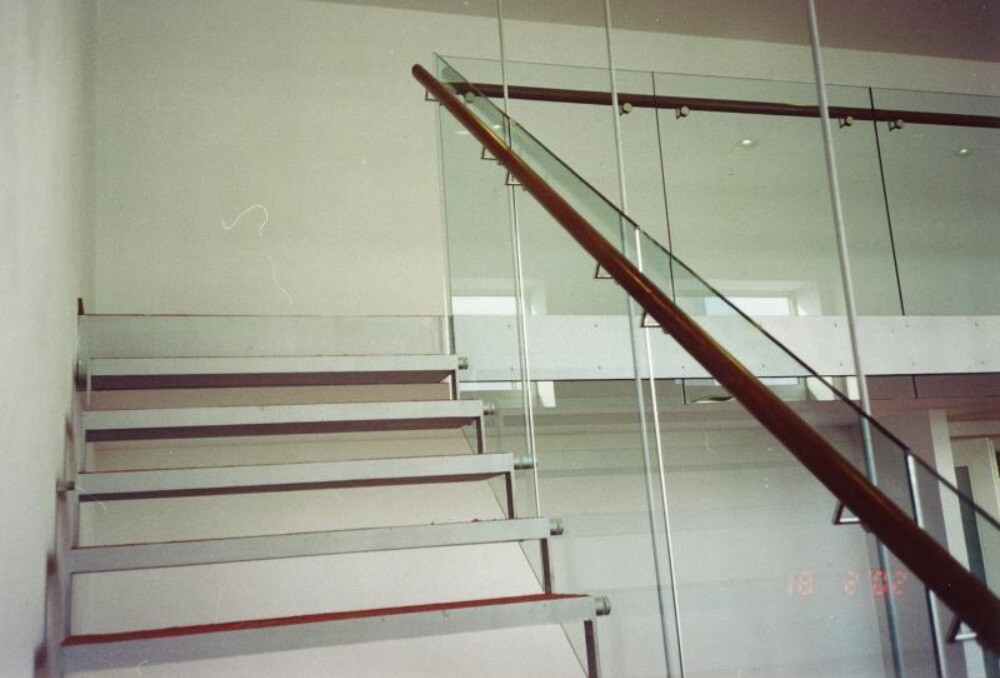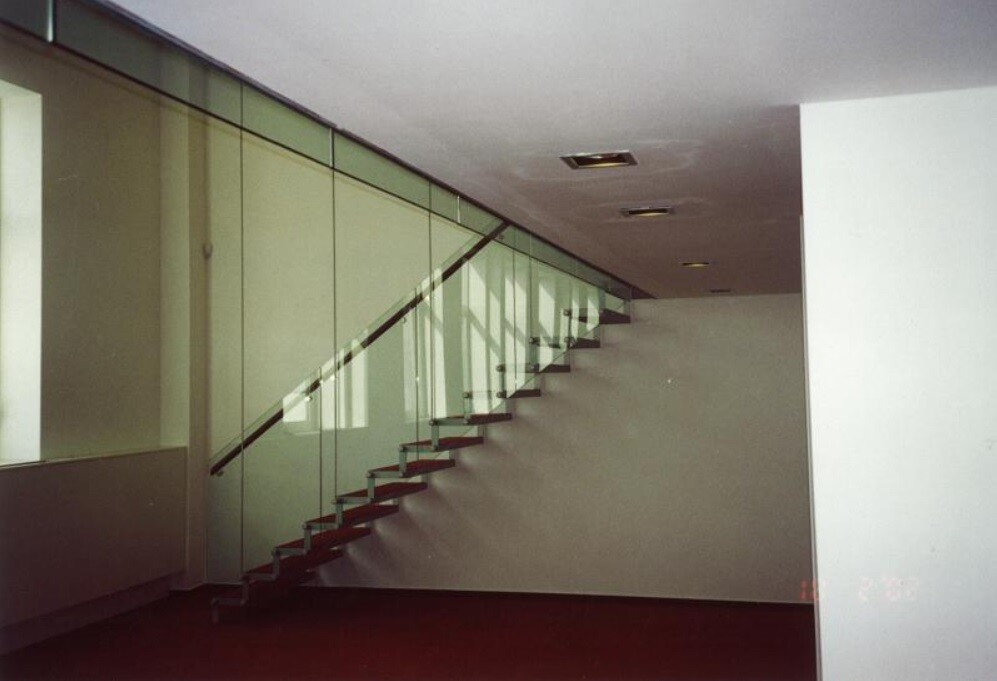 Skleněné zábradlí kotvené bodově na ocelovou konstrukci schodiště a galerie administrativní budovy OITR na Strahově.