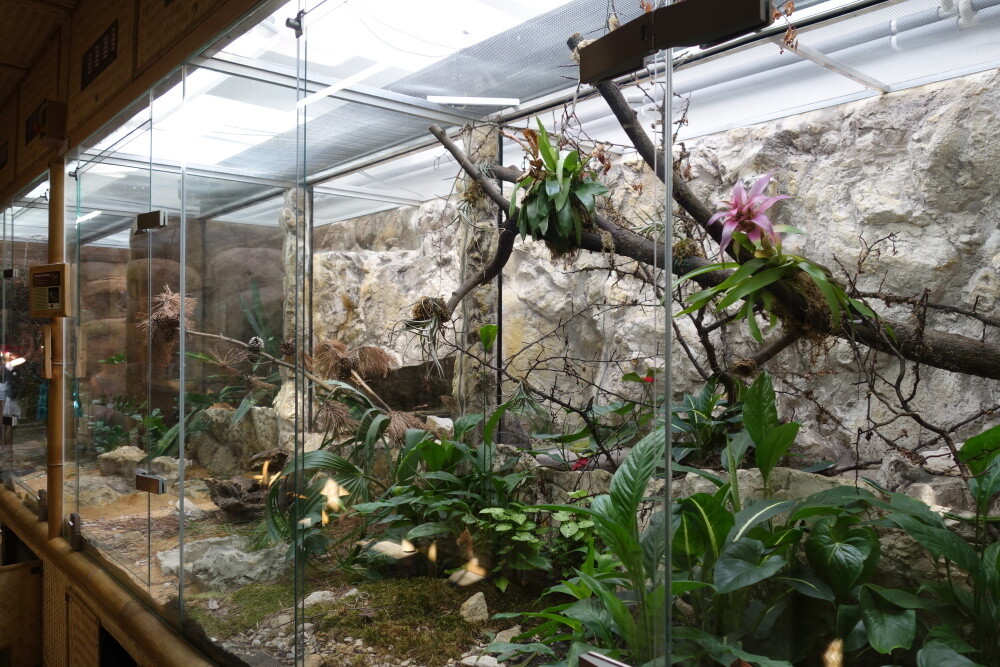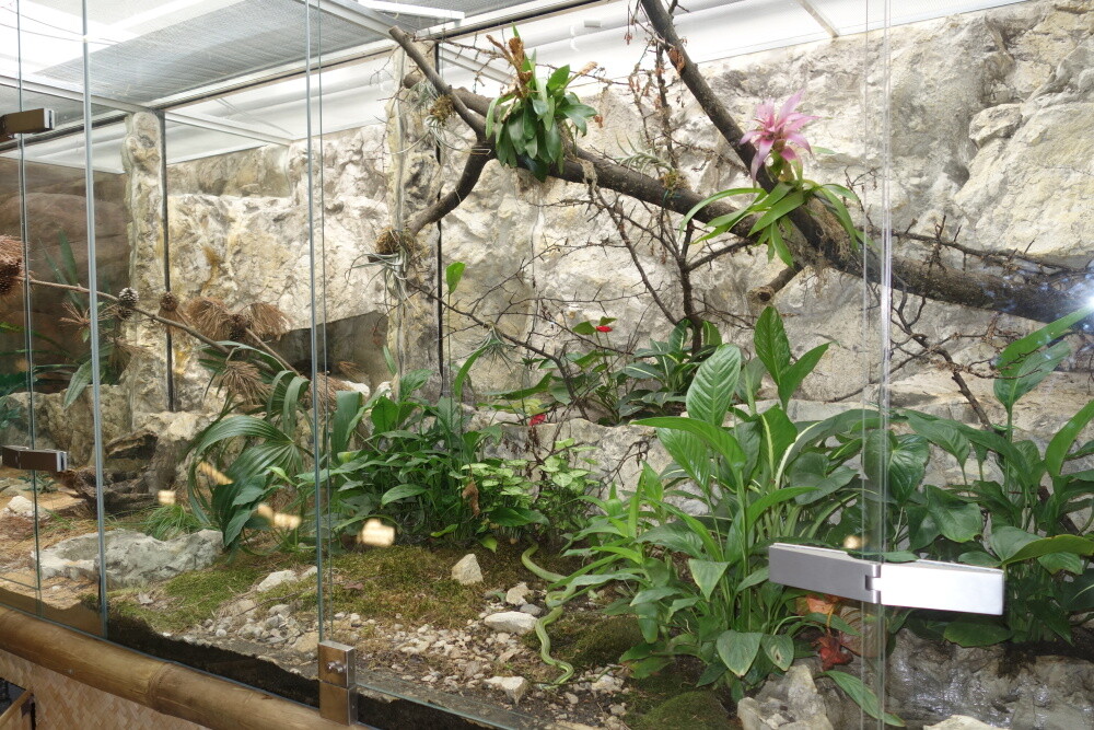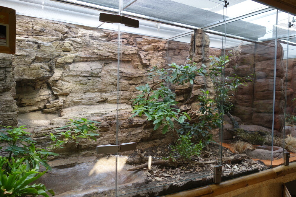 Terária jedovatých plazů z lepeného kaleného skla se dveřmi. Provedení a statický posudek RECOC Ing. Košek. Realizace vč. obvodových rámů a vnitřních dělicích a výztužných žeber z jednovrstvého tvrzeného skla