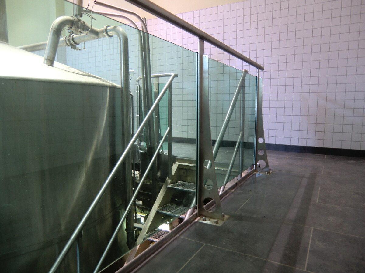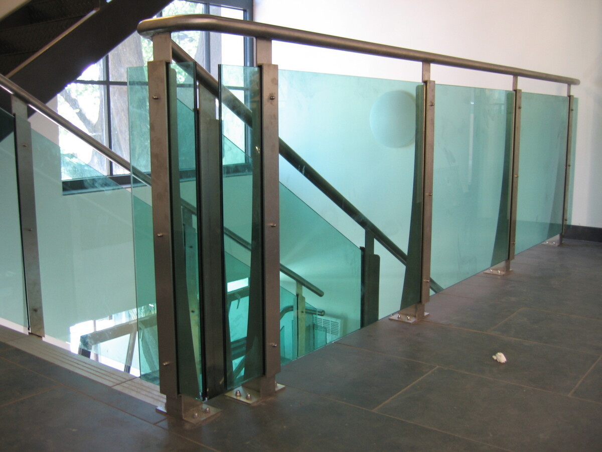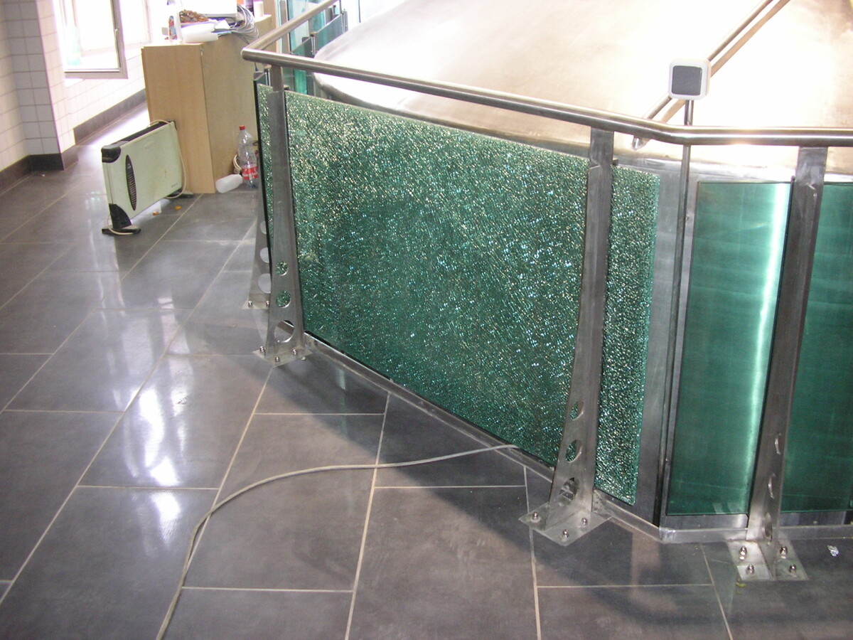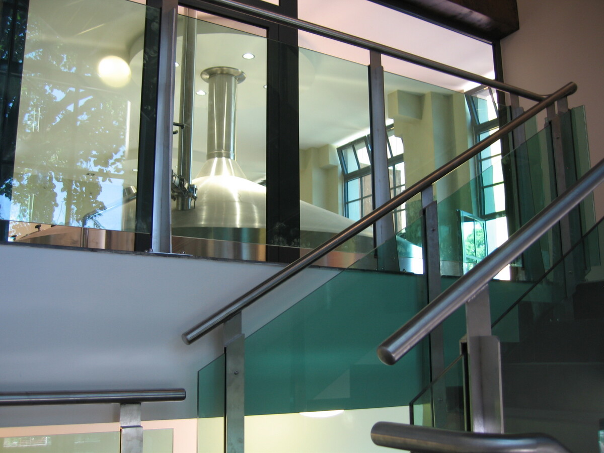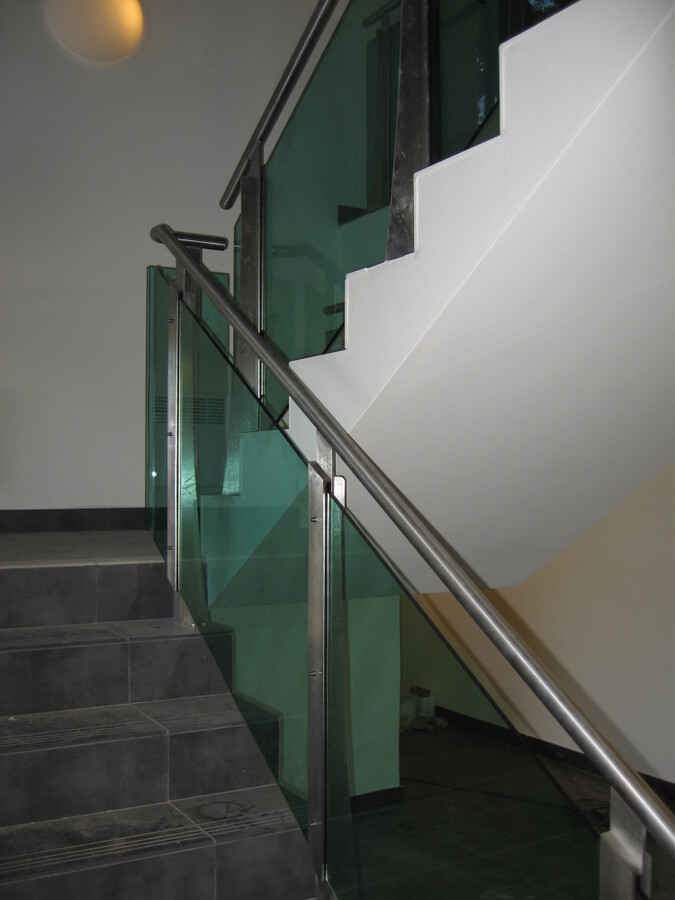 Skleněné výplně nerezového zábradlí z bezpečnostního kaleného lepeného skla VSG ESG Connex 5.5.2 se zelenou folií.