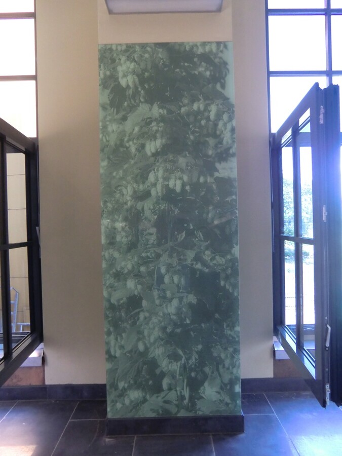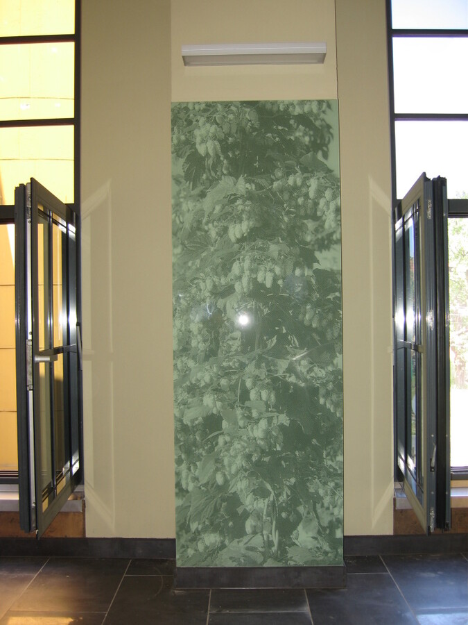 Motiv chmelu nanášen na sklo sítotiskovou metodou před kalením. Lepeno silikonovým lepidlem přímo na omítku.
