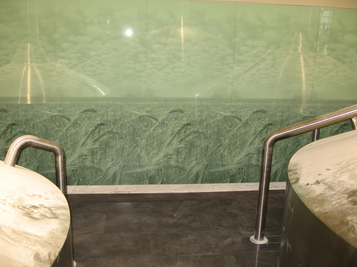 Celoplošný obklad stěn kaleným smaltovaným sklem Colorbel tl. 6 mm s motivem žitného pole a chmelového štoku.