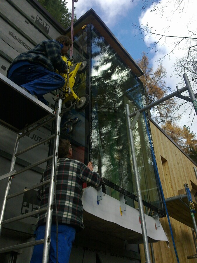 Strukturálně lepená celoskleněná mansarda. Izolační trojskla s černěným přesahem přes spodní a horní rám, lepené nároží s přesahy skel.