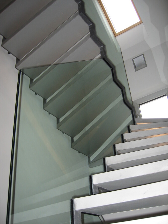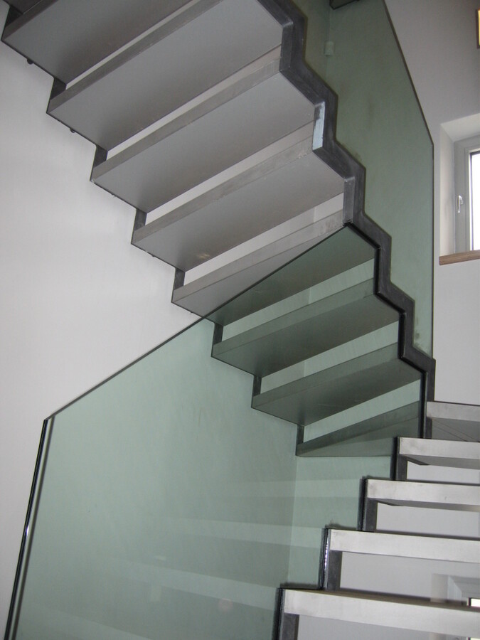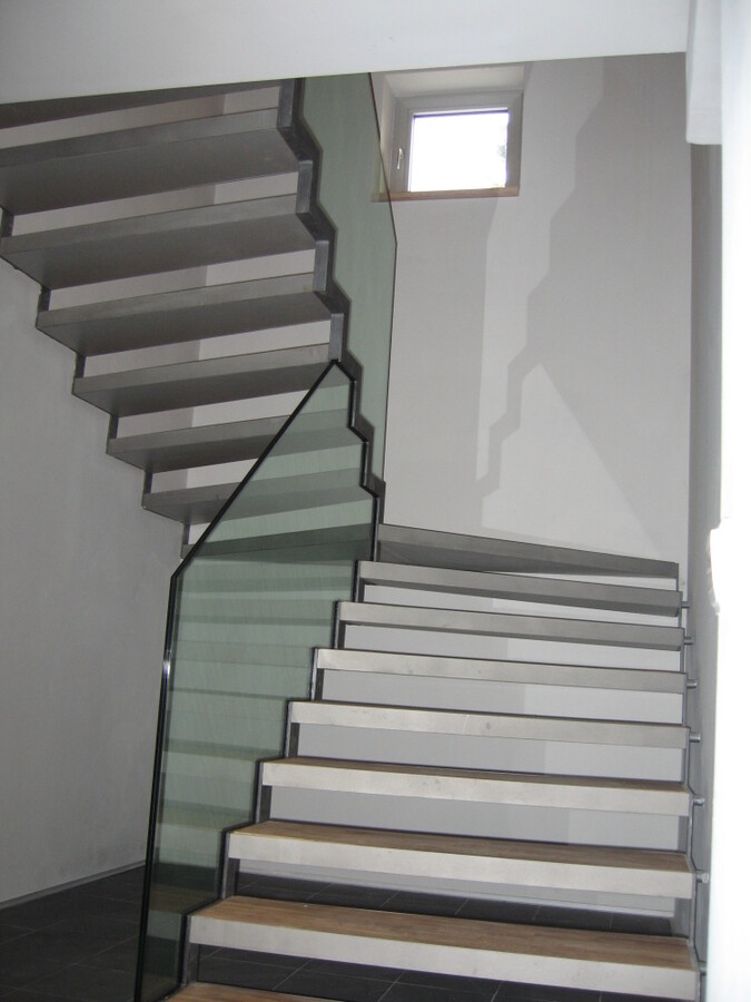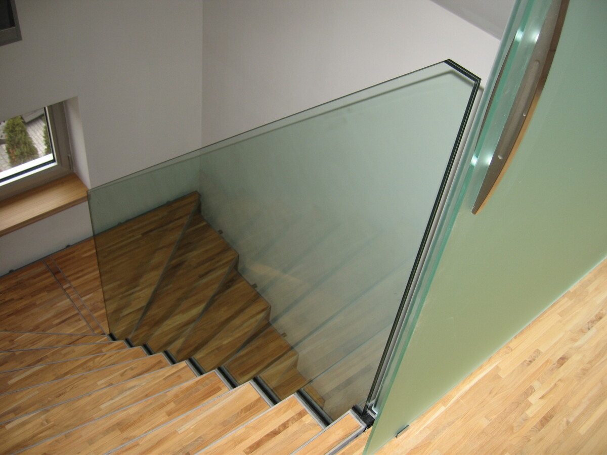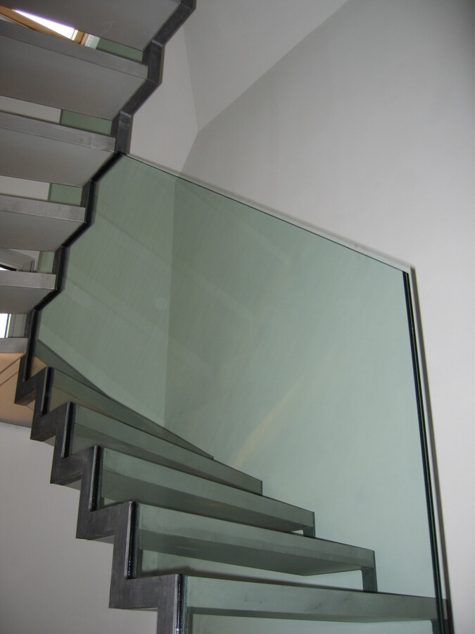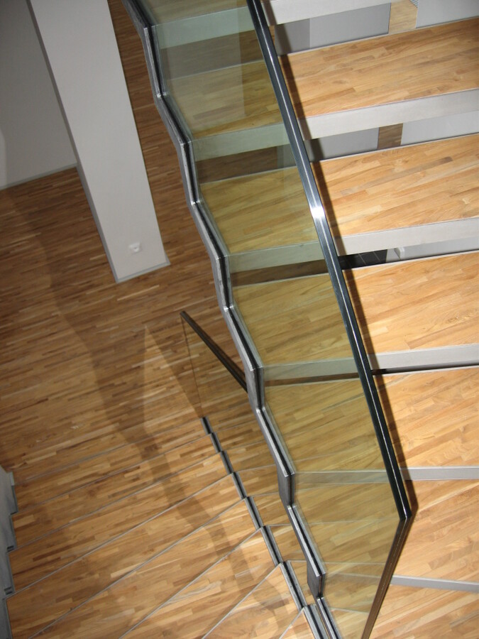 Celoskleněné zábradlí z bezpečnostního lepeného skla CONNEX, na spodní hraně řezané vodním paprskem dle tvaru schodnic.