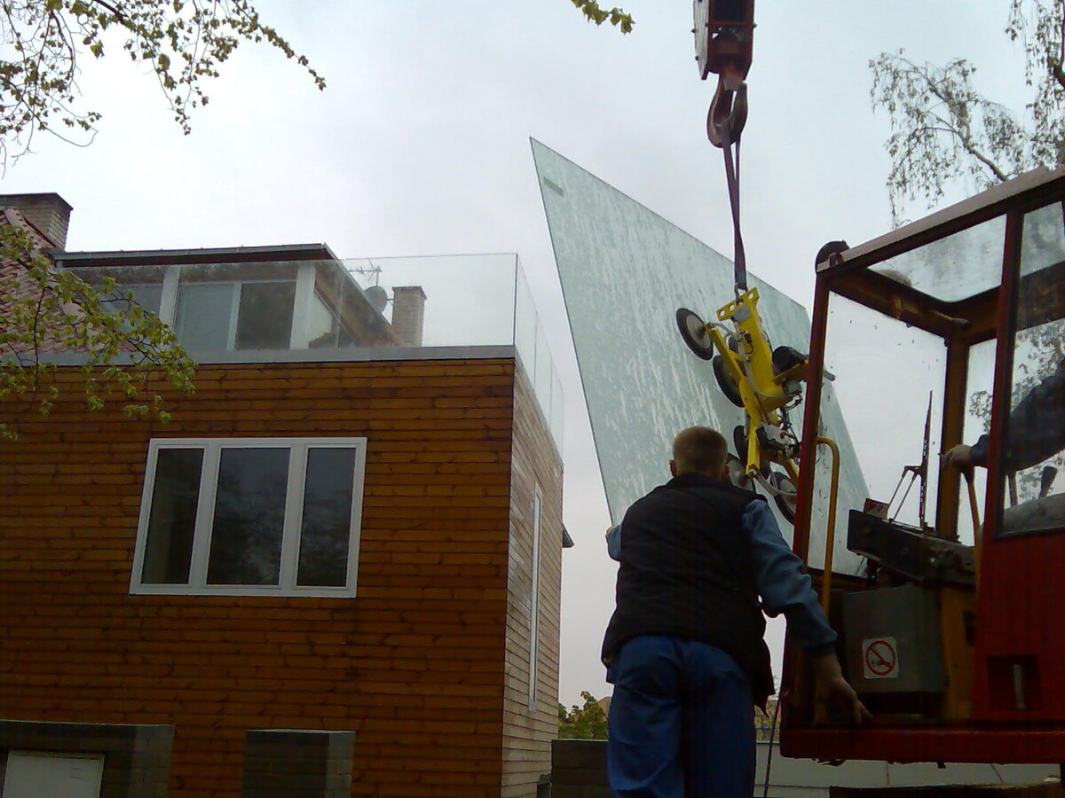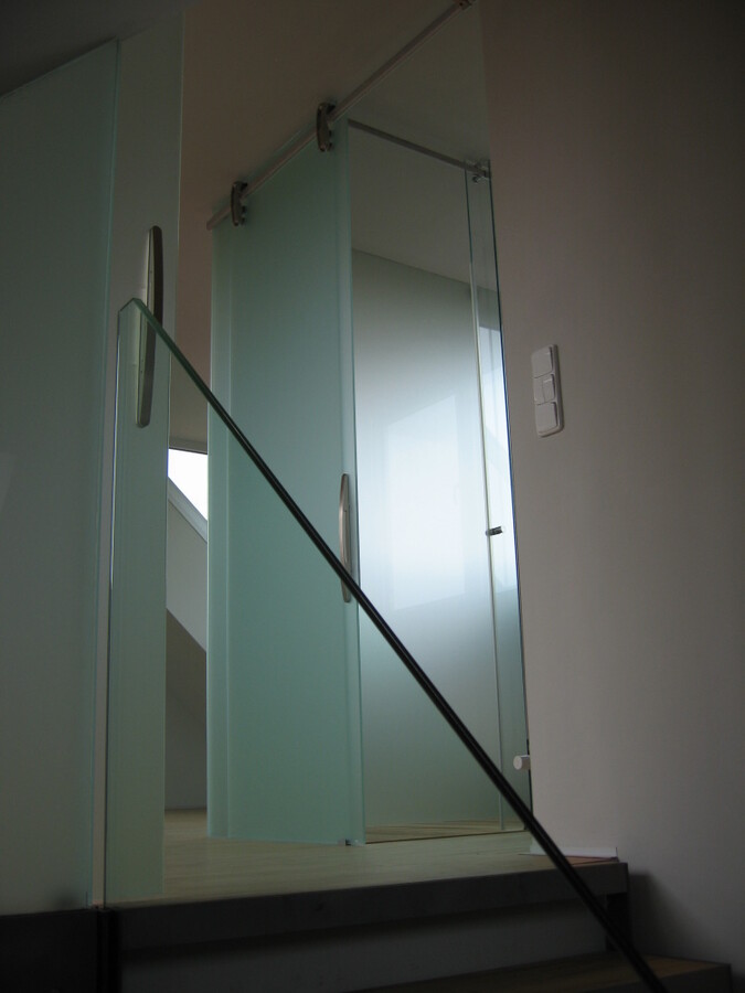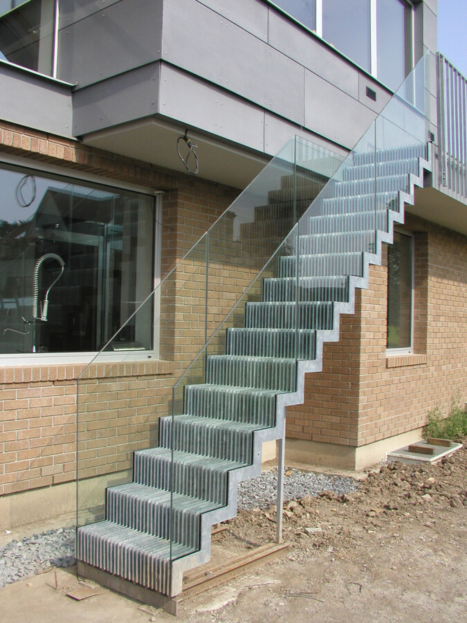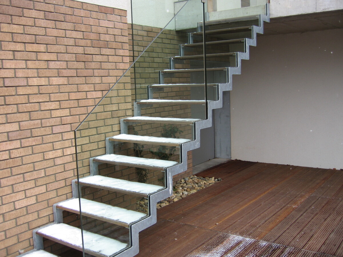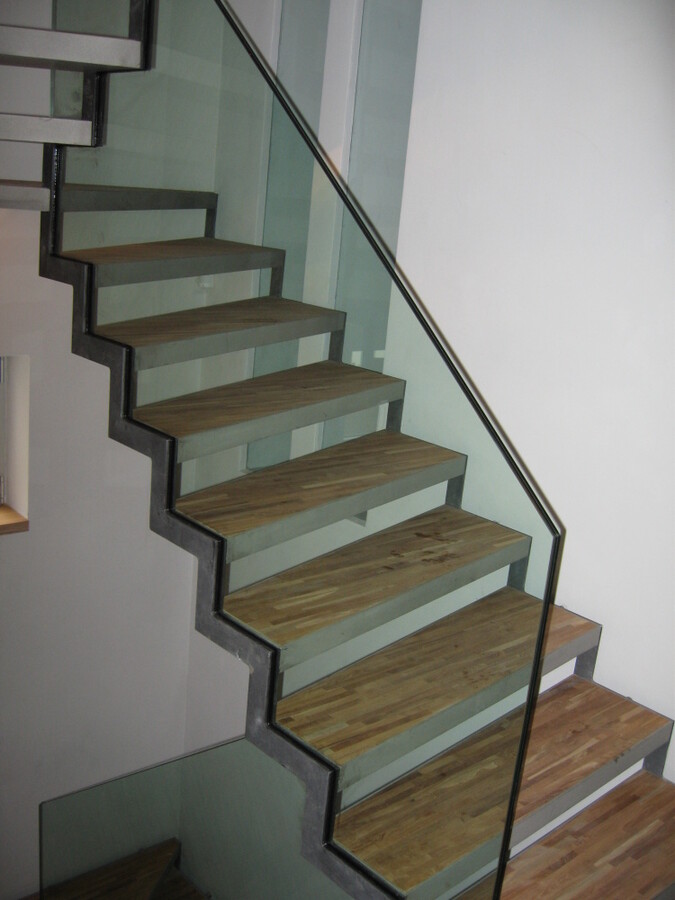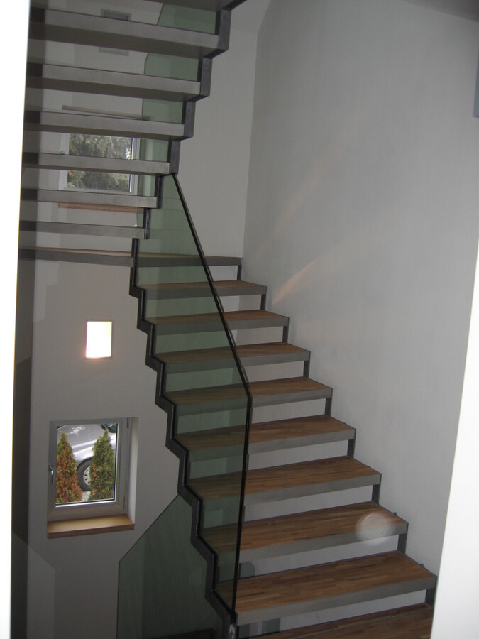 Celoskleněné zábradlí z bezpečnostního lepeného skla CONNEX, na spodní hraně řezané vodním paprskem dle tvaru schodnic.