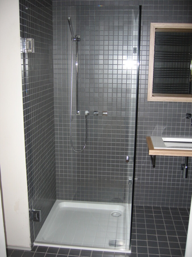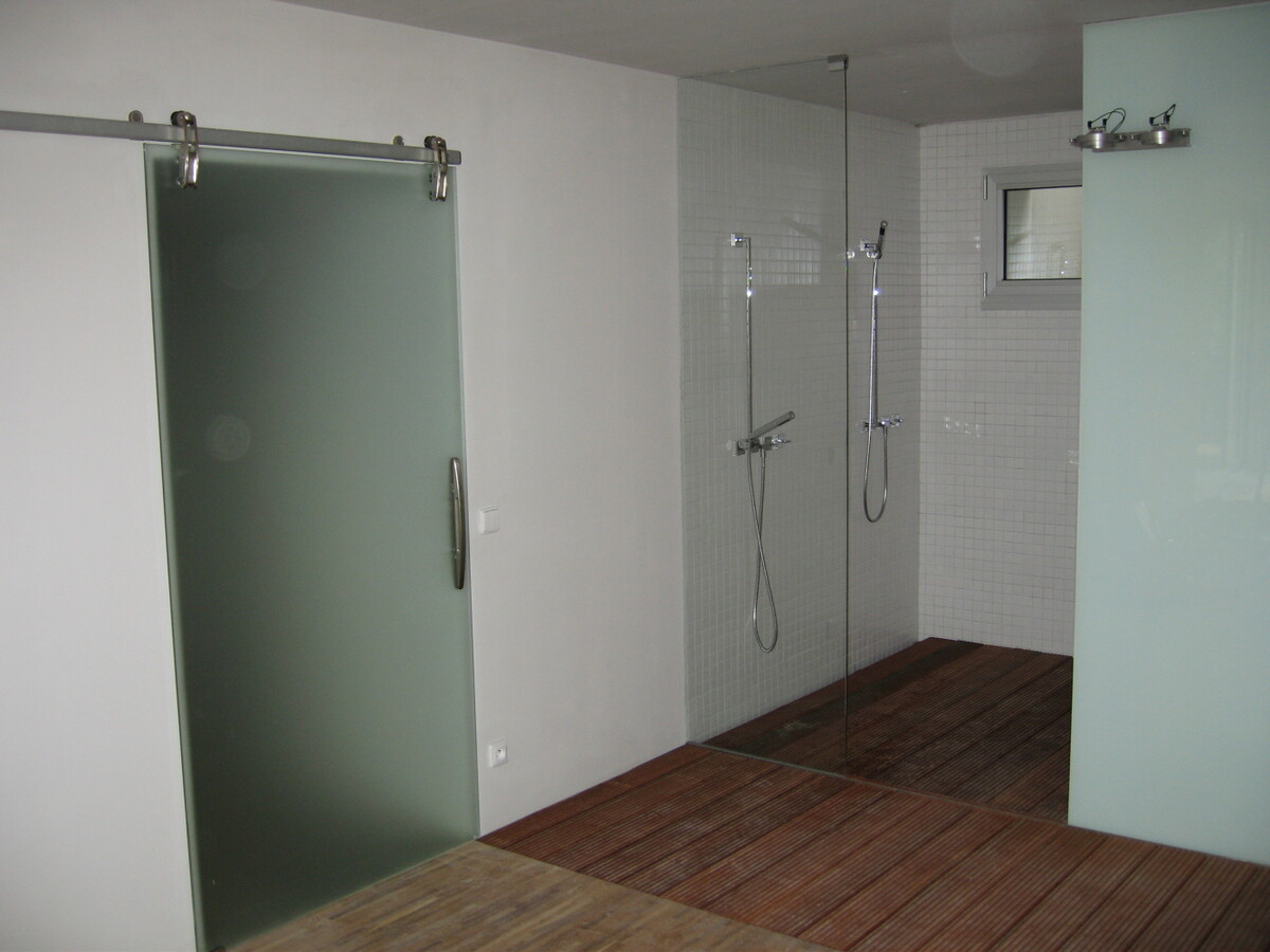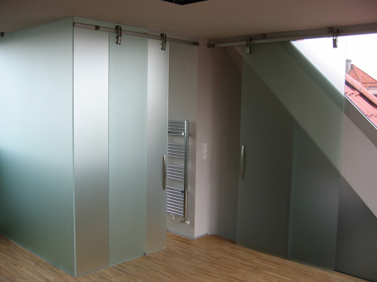 Vestavba skleněného boxu koupelny v podkroví s posuvnými dveřmi, obklad sauny sklem Colorbel, realizace zástěn sprchových koutů.