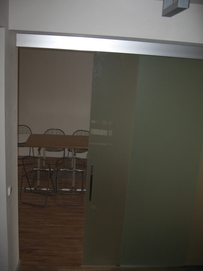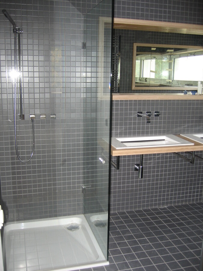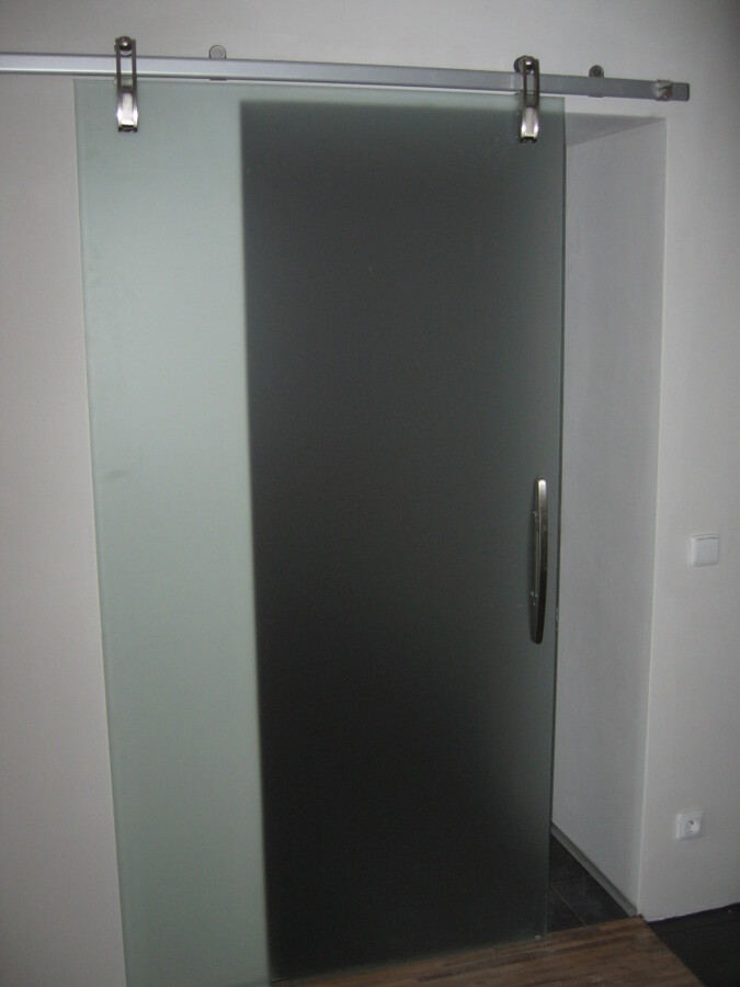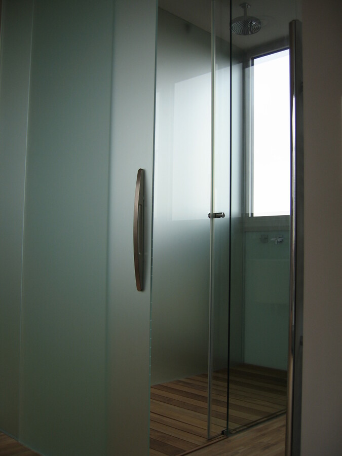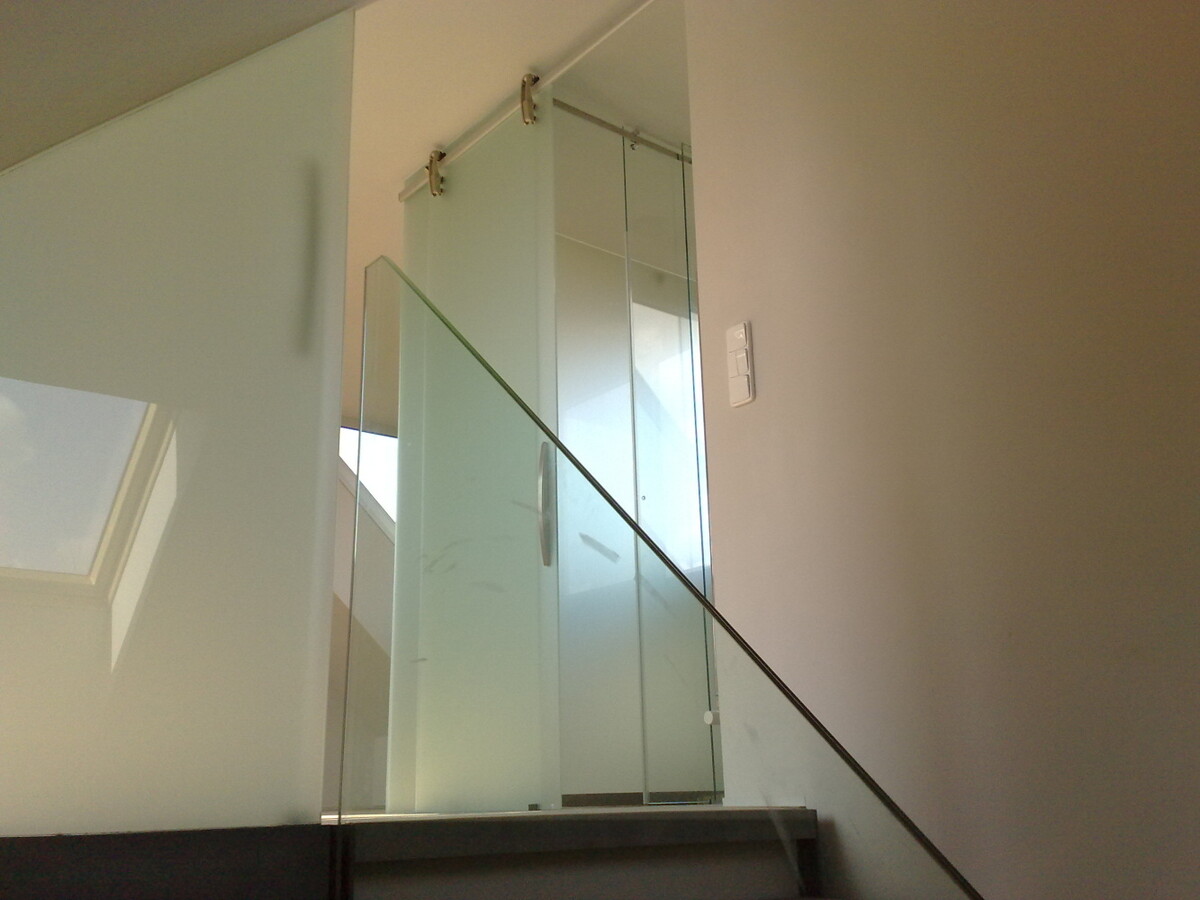 Vestavba skleněného boxu koupelny v podkroví s posuvnými dveřmi, obklad sauny sklem Colorbel, realizace zástěn sprchových koutů.
