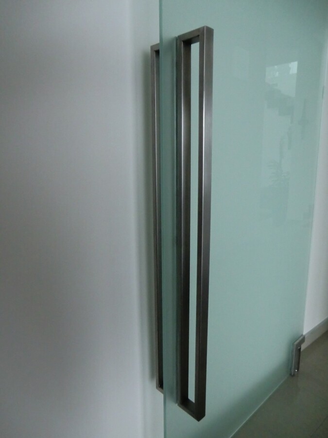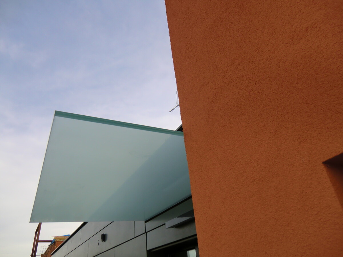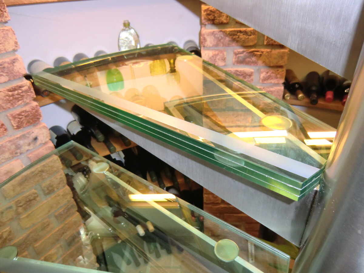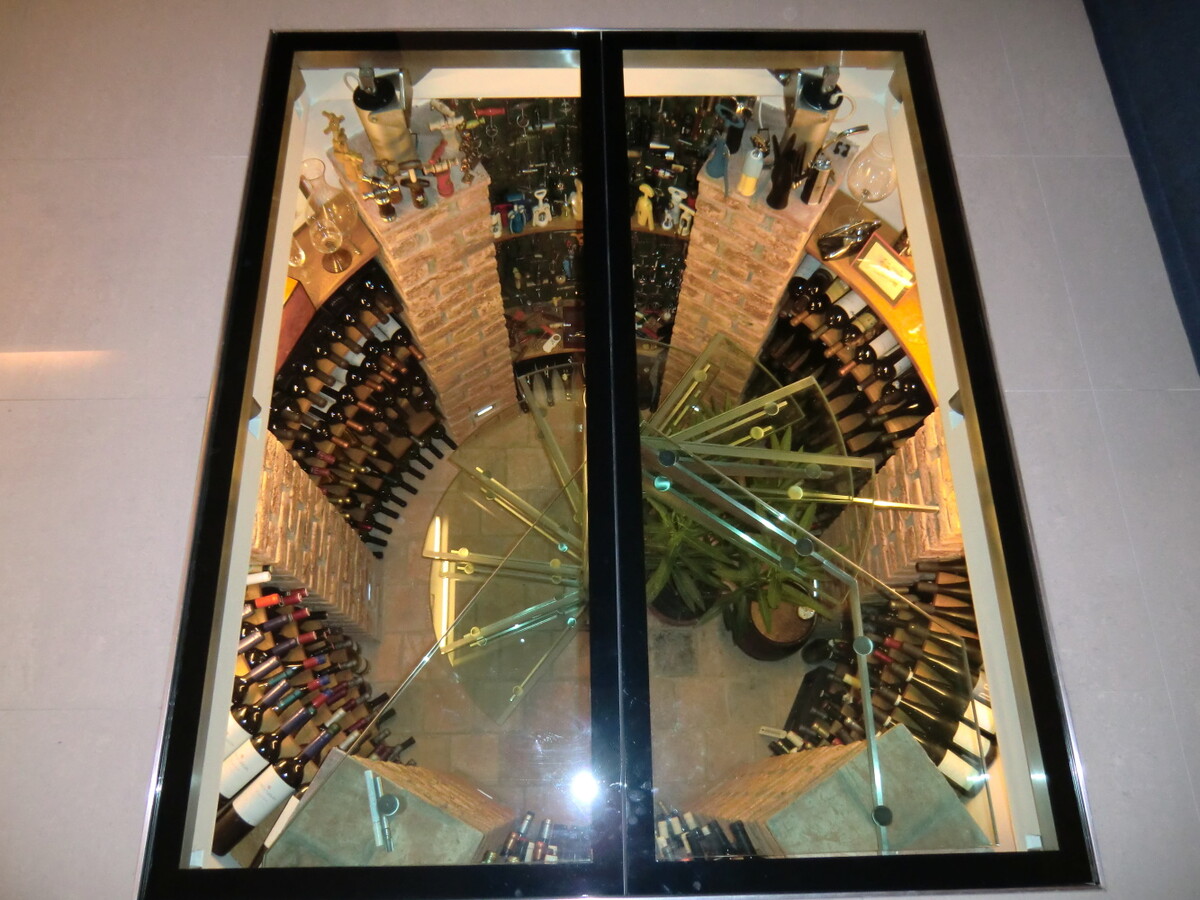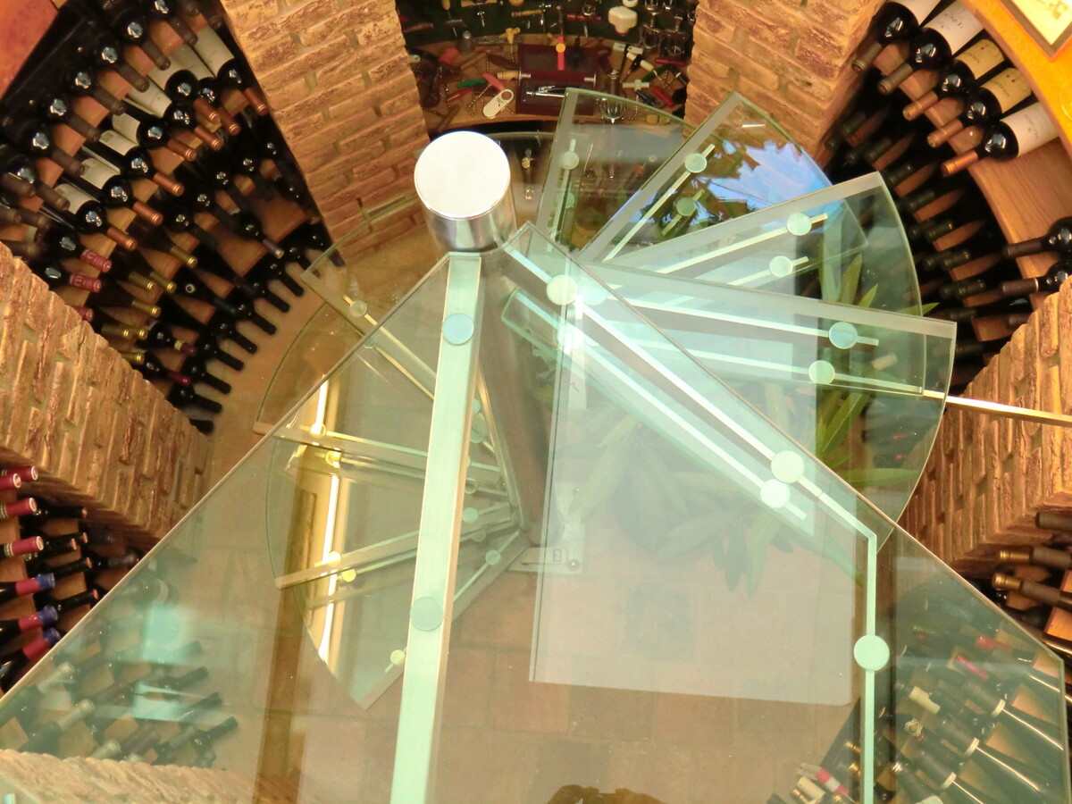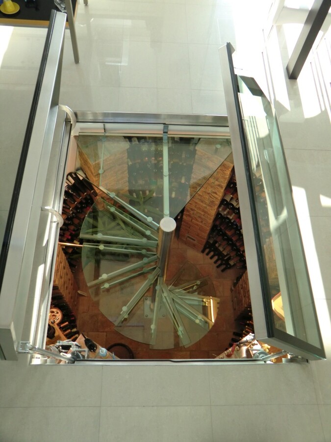 Realizace vinotéky pod elektromechanicky otevíranou pochozí podlahou. Sestup po vřetenovém nerezovém schodišti se skleněnými nášlapy a podestou. Skleněné prvky nalepeny na konstrukci UV lepidlem na nerezové terče s možností rektifikace.