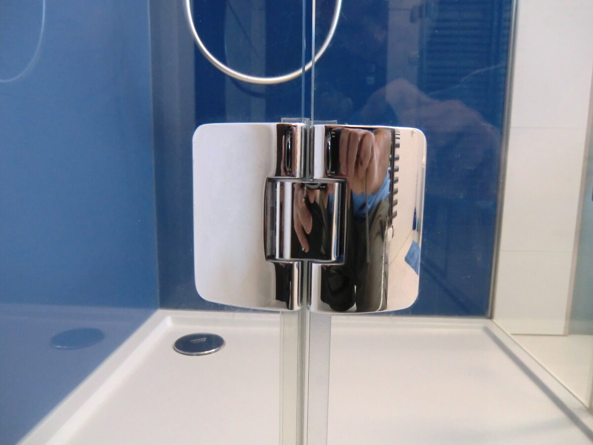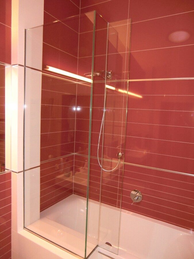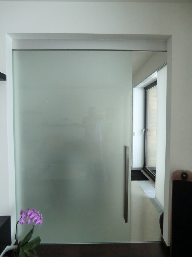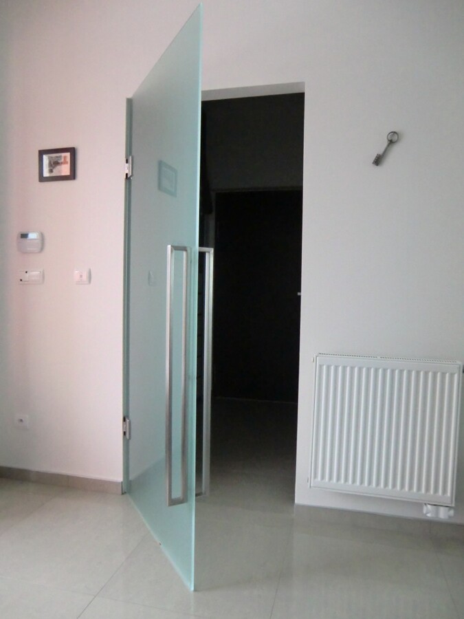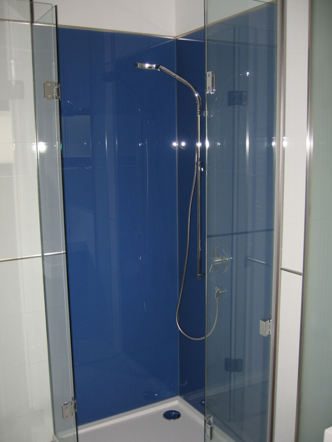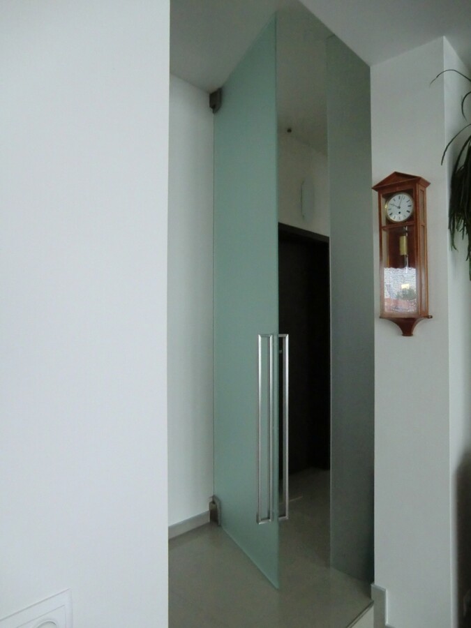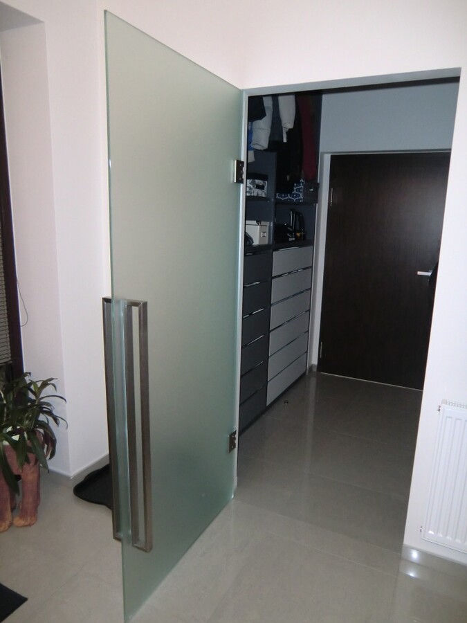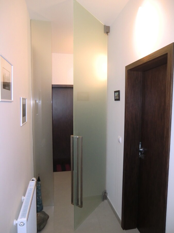 Realizace skleněných dělících příček s posuvnými dveřmi, kyvných dveří s automatickým samozavíračem, schodiště se skleněným zábradlím, koupelnové zástěny a sprchového celoskleněného koutu s obkladem sklem ERTEX COLOR modré barvy.