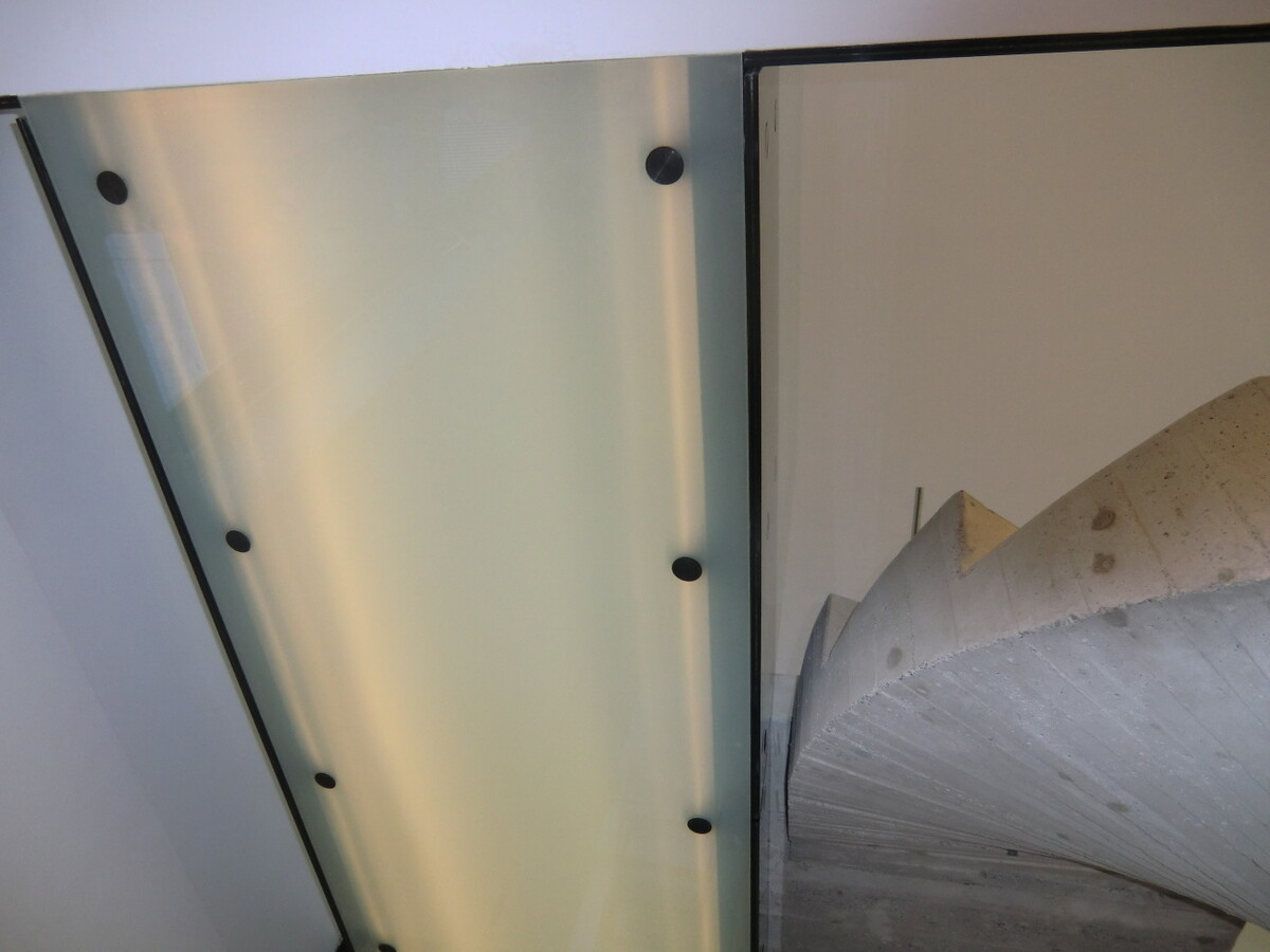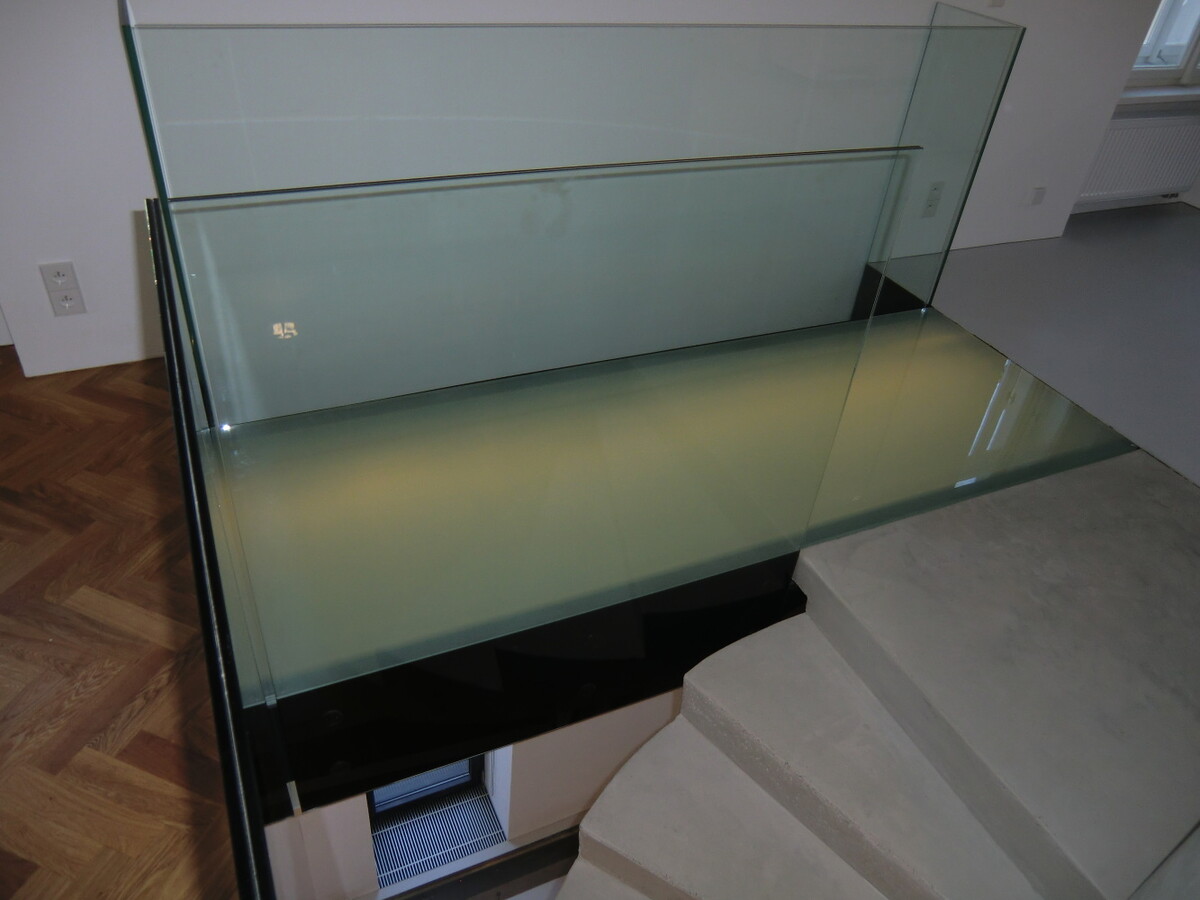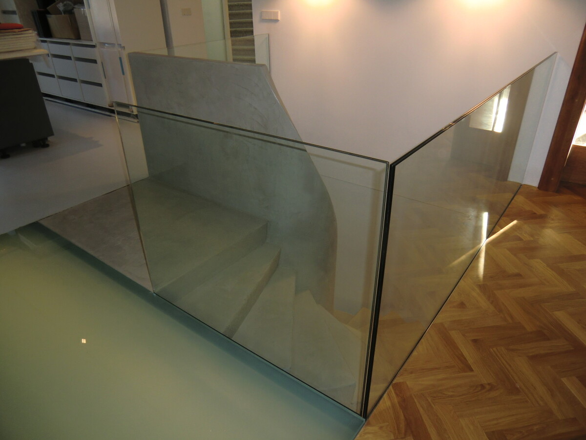 Celoskleněné zábradlí ze skla VSG ESG 10.10.2 uchycené přes nerezové zapuštěné terče.
