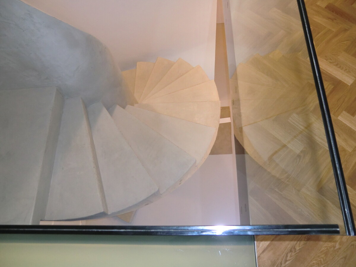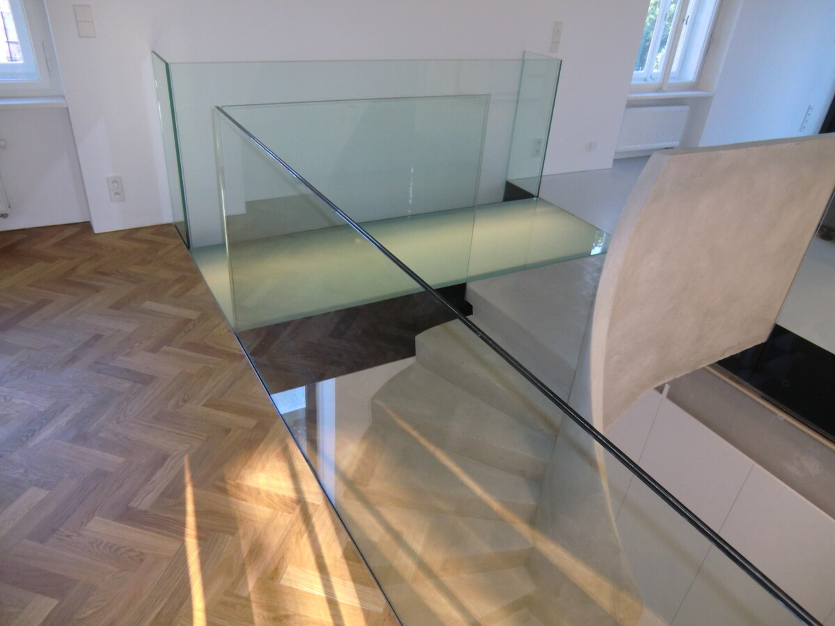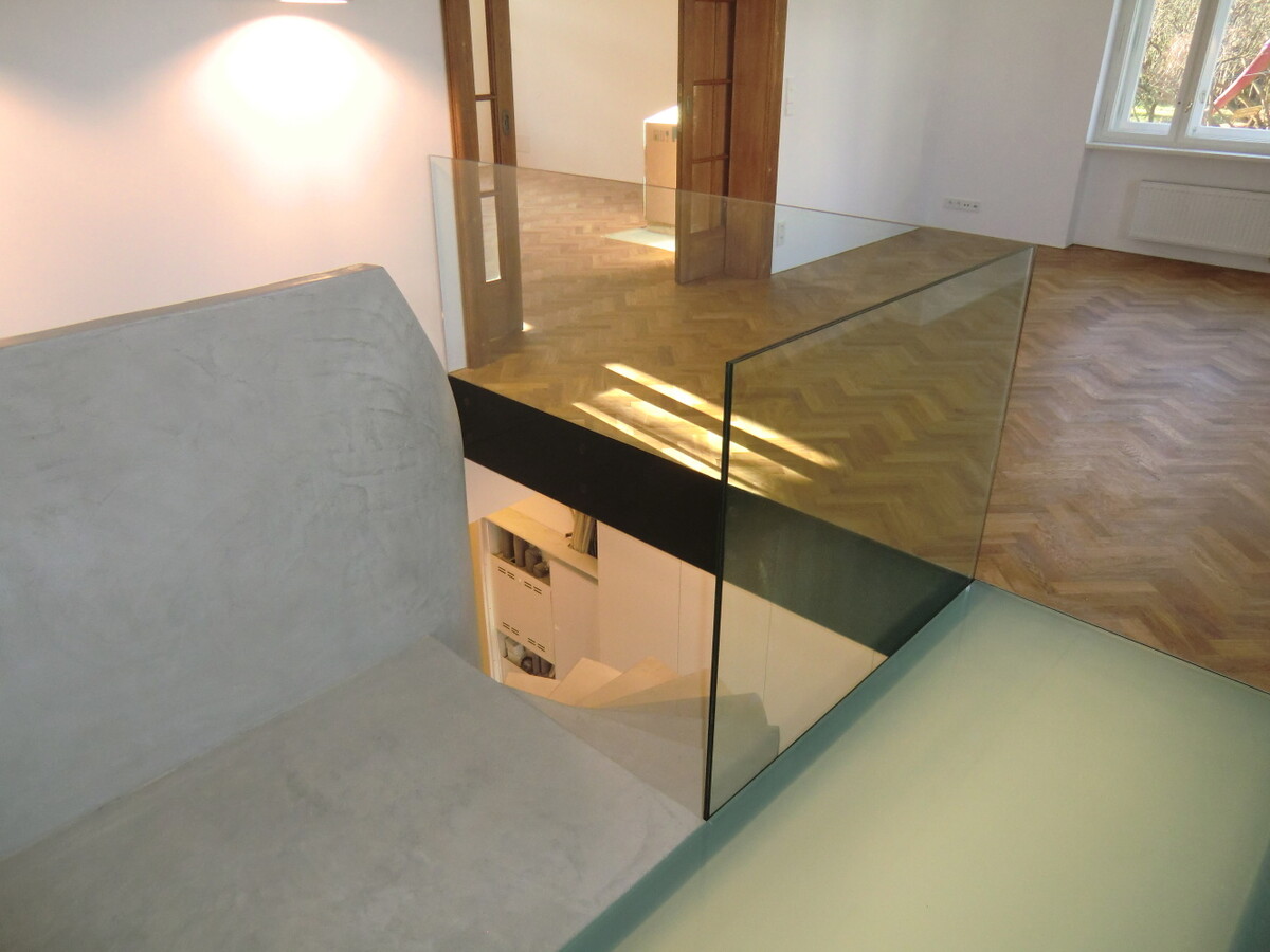 Celoskleněné zábradlí ze skla VSG ESG 10.10.2 uchycené přes nerezové zapuštěné terče.
