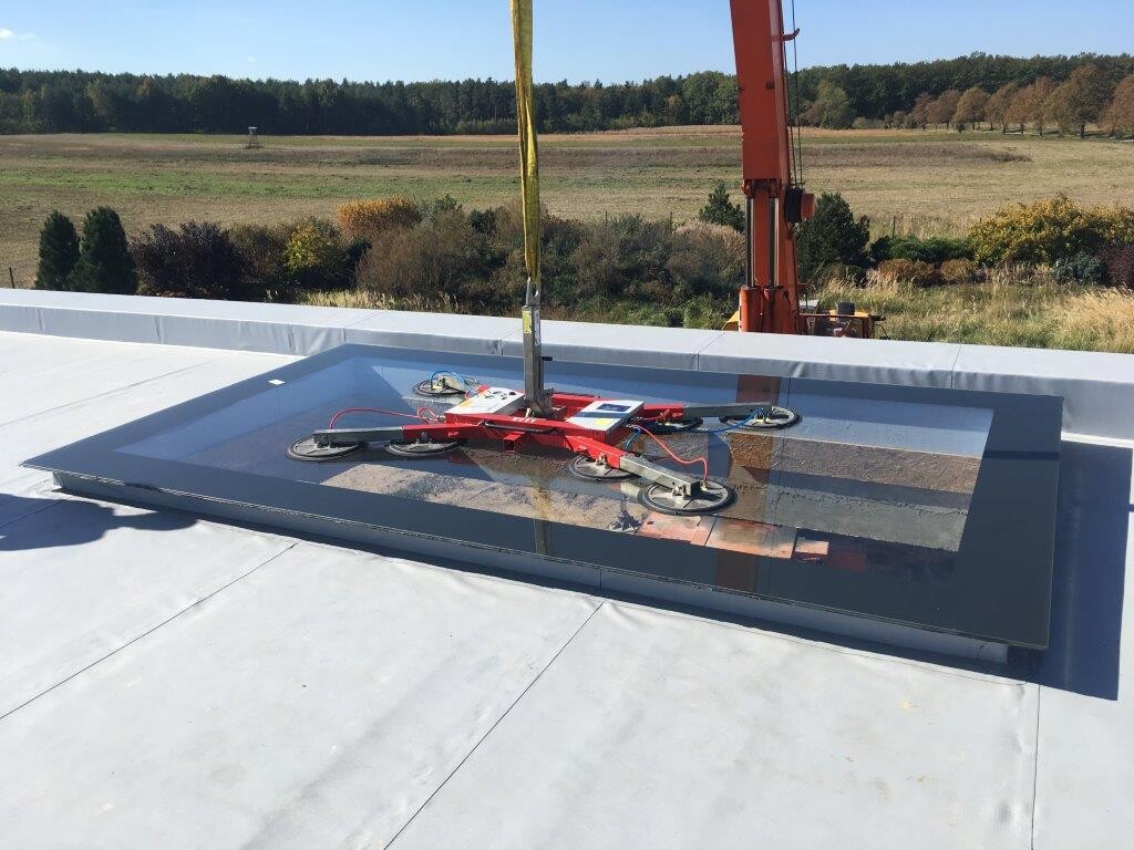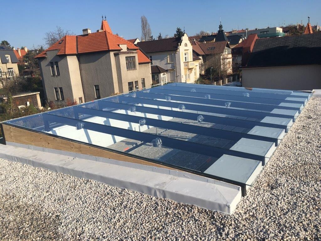 Vícerozměrný střešní světlík složený z jednotlivých skleněných tabulí
