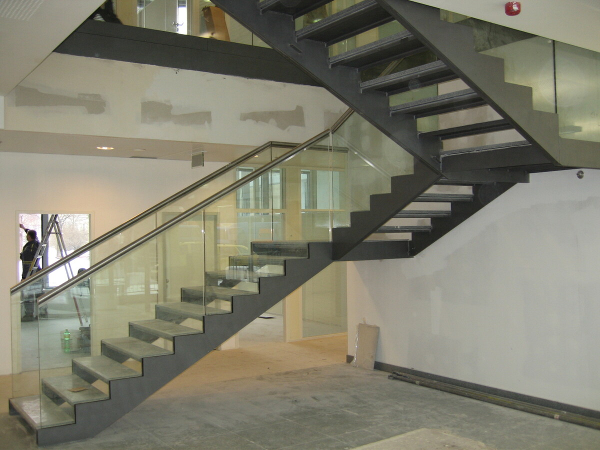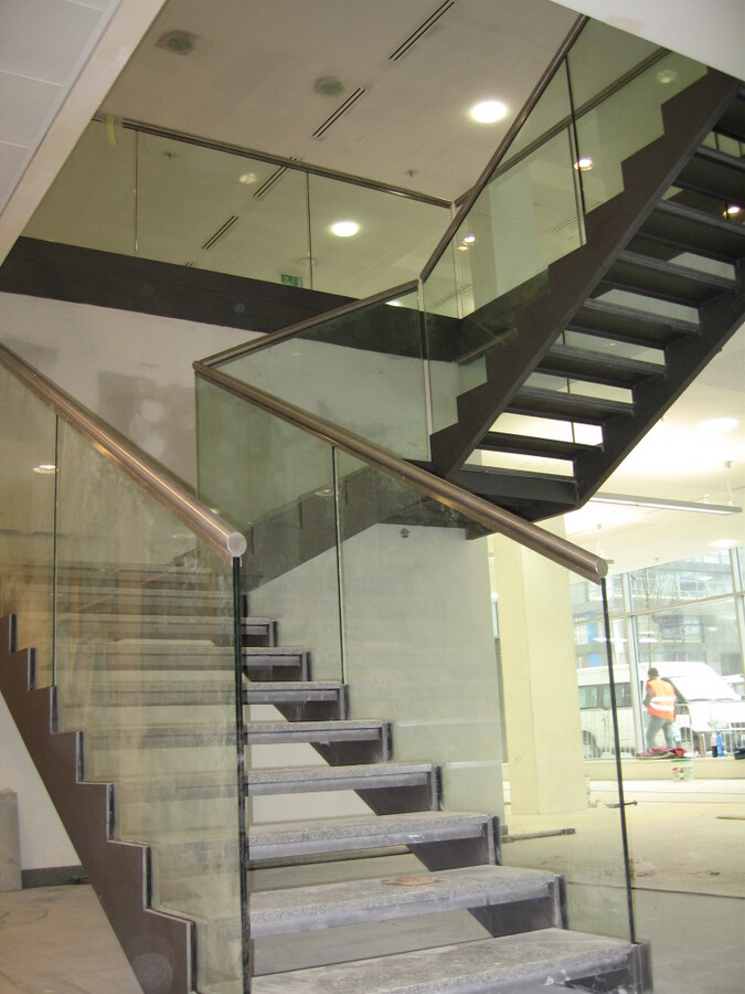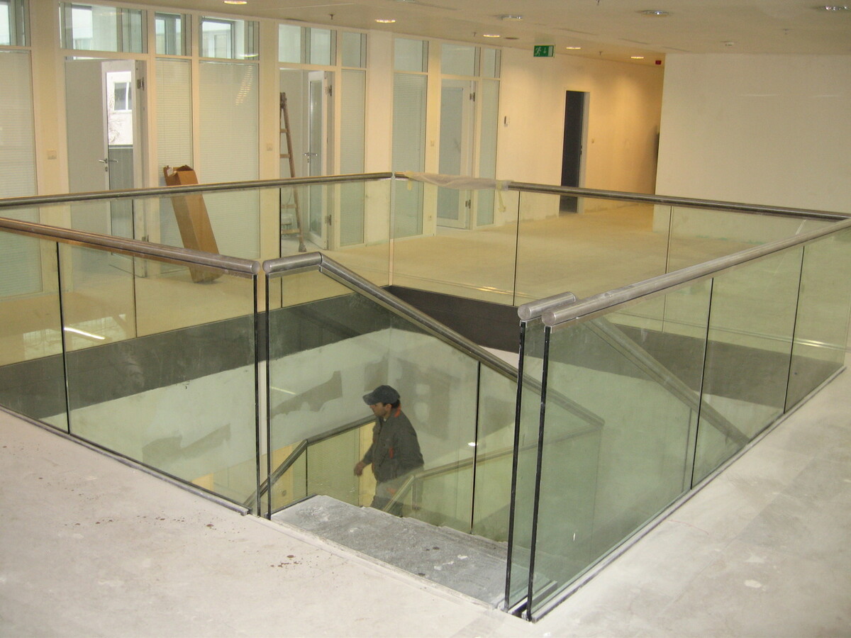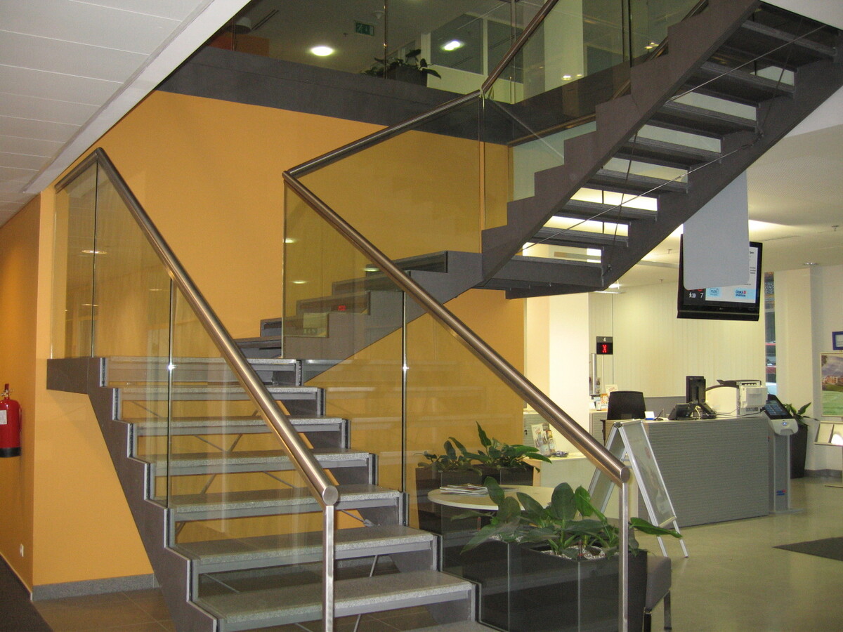Skleněné zábradlí schodiště a galerie ze skla bezpečnostního lepeného Connex.