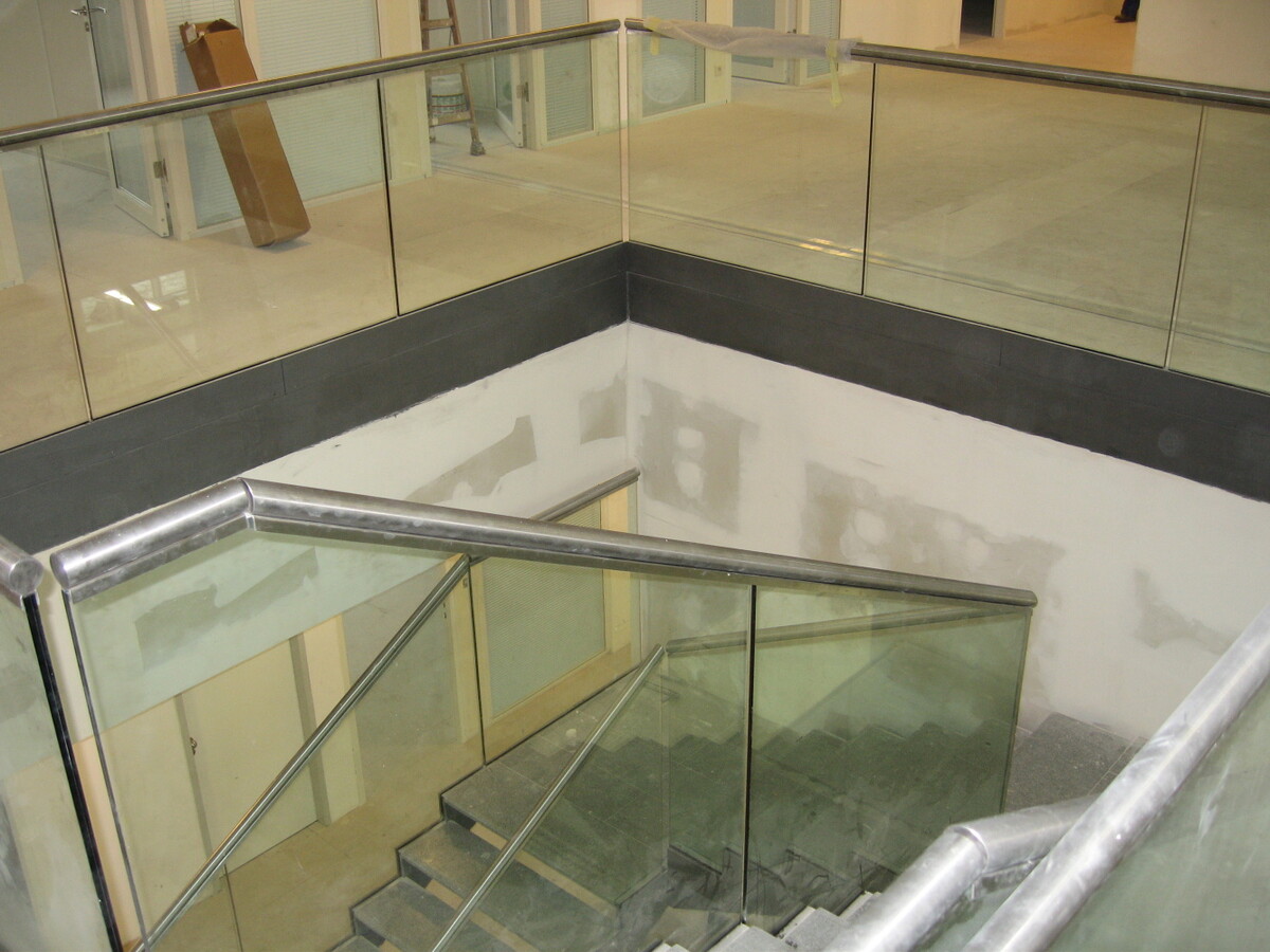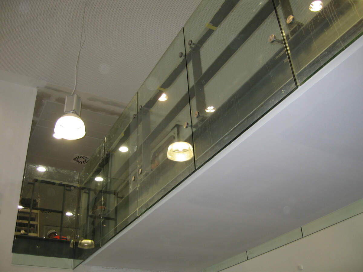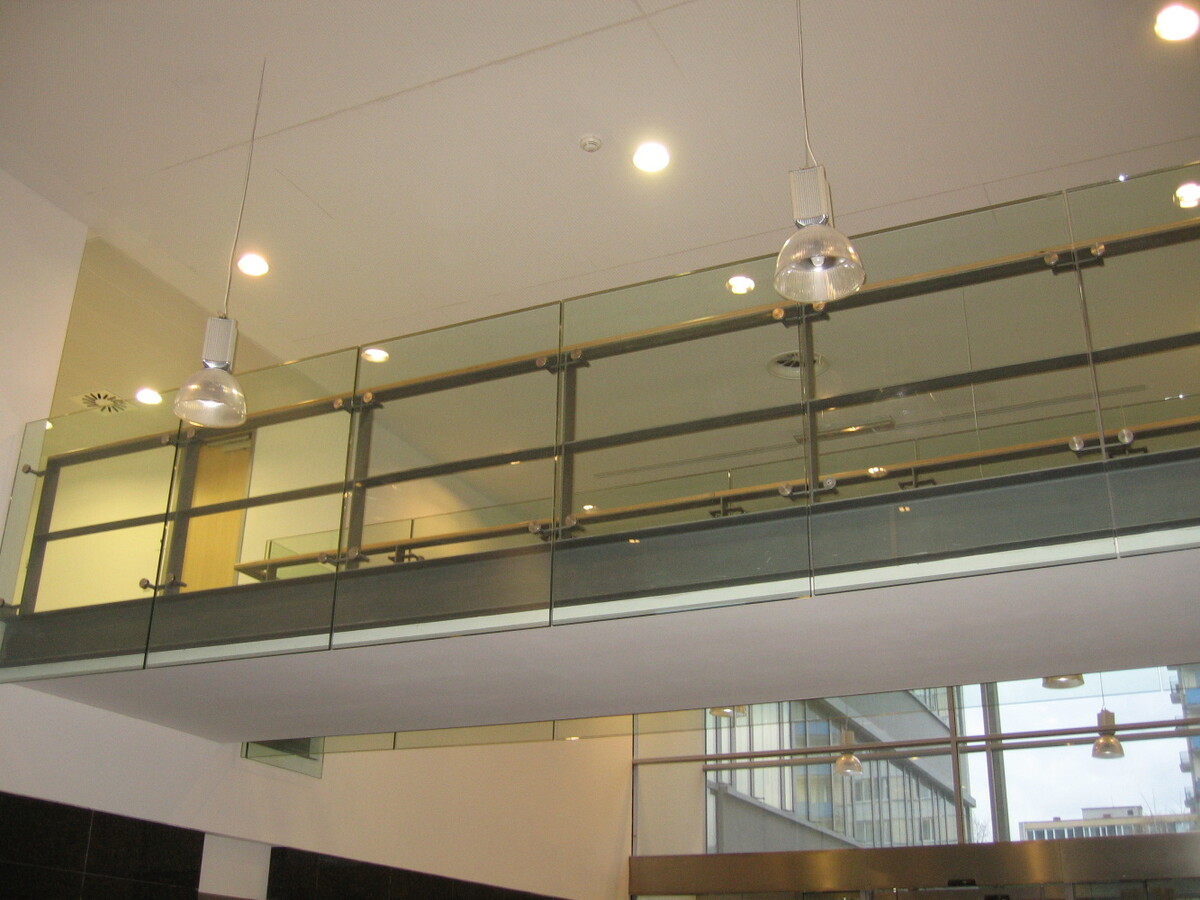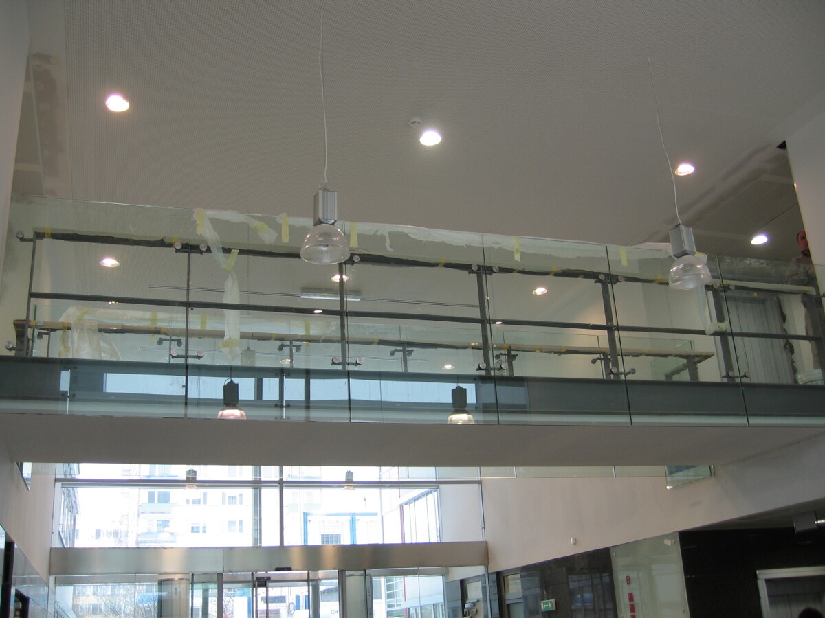 Skleněné zábradlí galerií z kaleného bezpečnostního lepeného skla kotvené na terče.