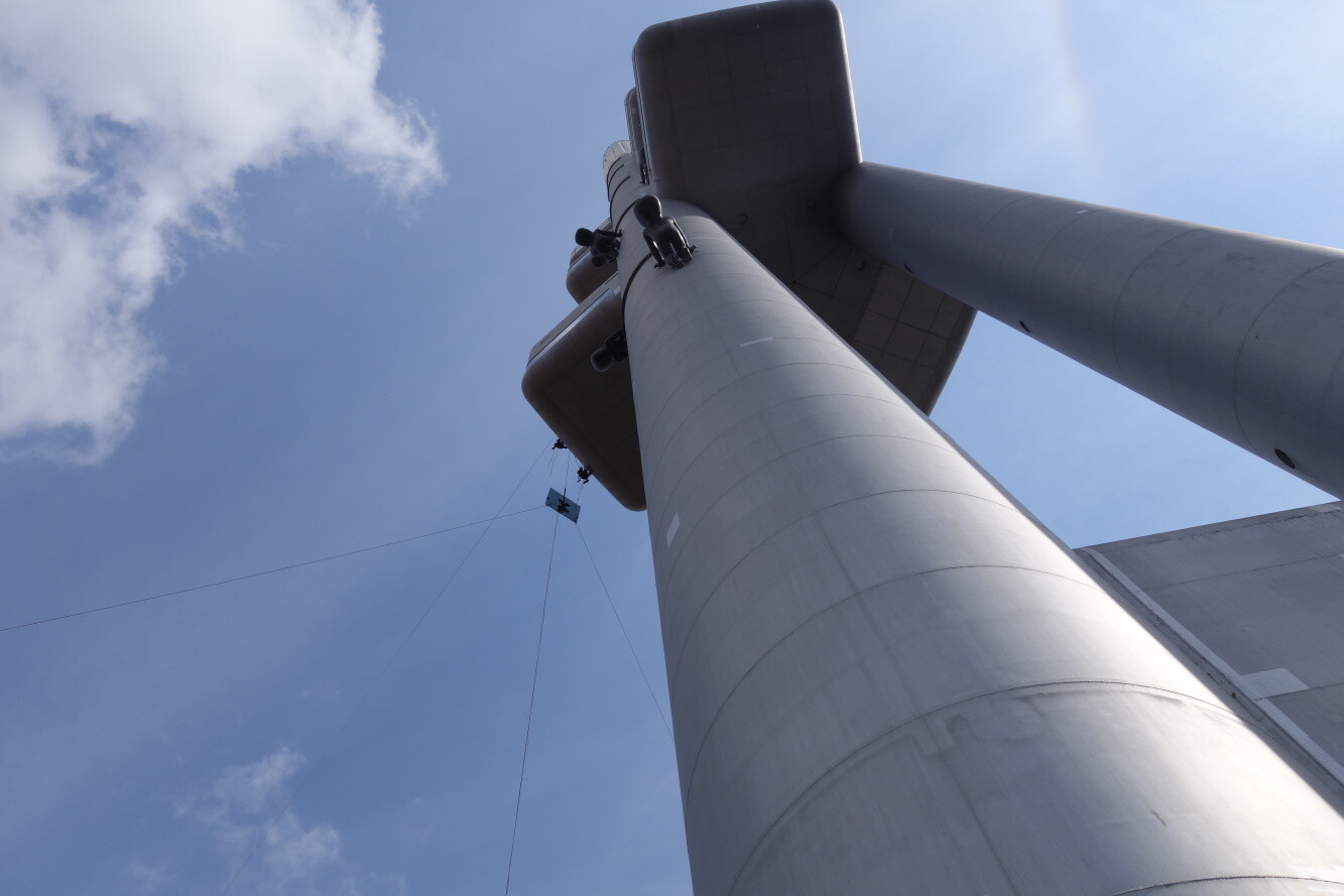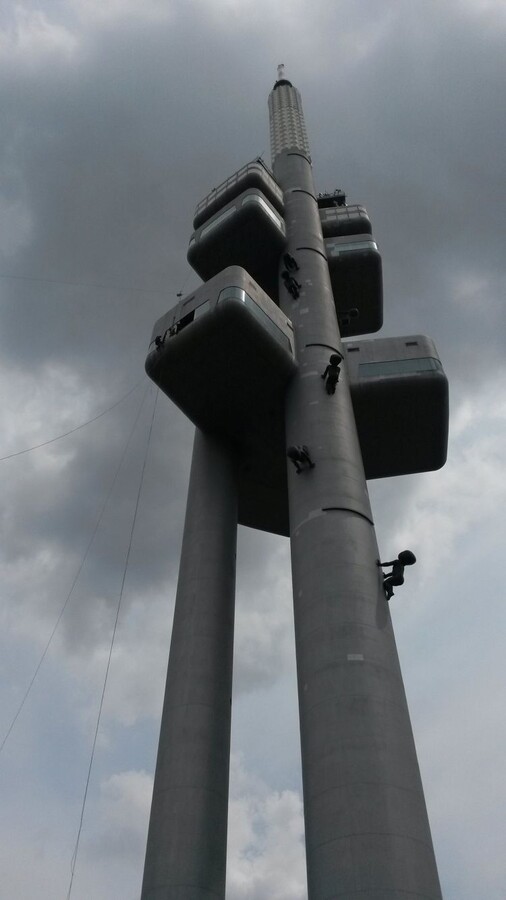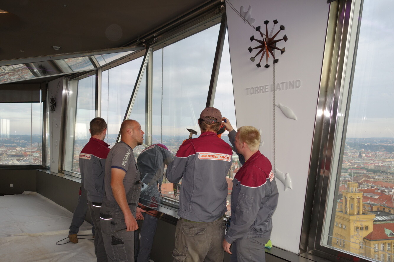 Výměna pyrotechnikou poškozených skel restaurace ve výšce 60 metrů. Přesklívána 3 bezpečnostní lepená skla Connex VSG 10.8.2 - tl. cca 19 mm, která jsou strukturálně vlepena do ocelového obvodového pláště stavby. Hmotnost jednoho skla dosahuje 250 kg. Skla dopravována vně budovy speciálním řetězovým vrátkem a savkovým manipulátorem za asistence horolezců firmy Balance.