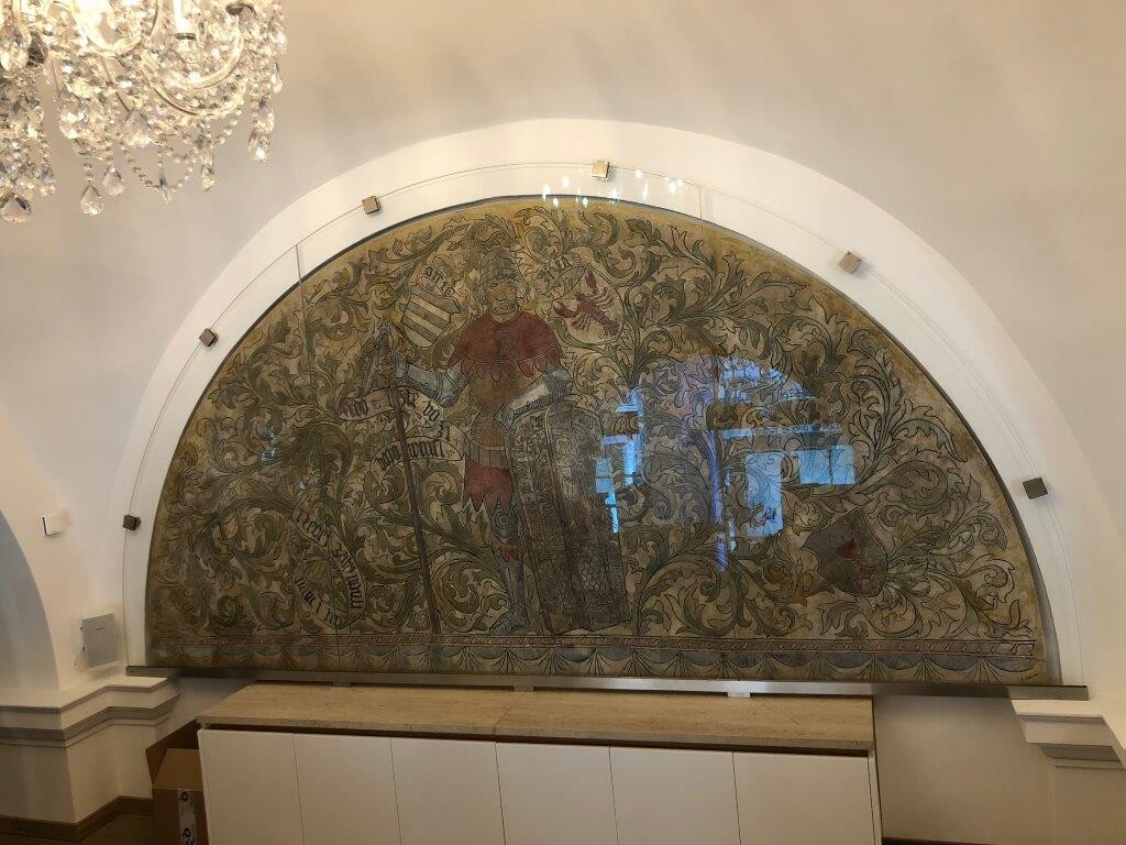 V tomto případě se jednalo o fresky Mikuláše Alše, pro jejichž zasklení bylo využito bezpečnostní sklo lepené s antireflexní úpravou.